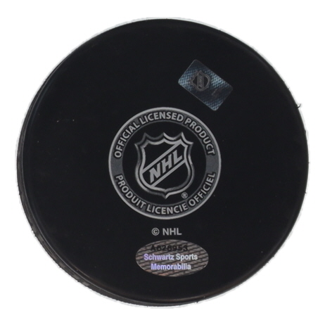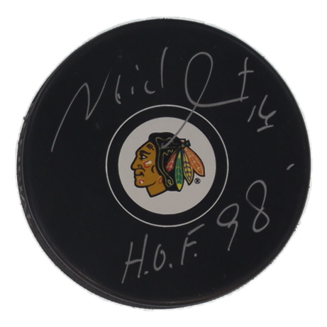 Chicago Blackhawks Logo Hockey Puck. Hand-signed and inscribed by Michel Goulet (HOF).
