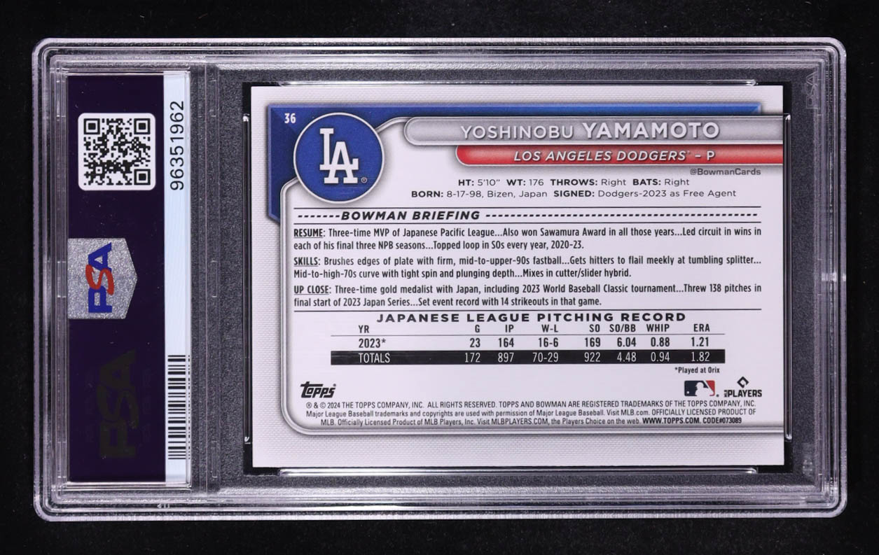 Yoshinobu Yamamoto 2024 Bowman Purple Pattern #36 RC #040/199 (PSA 10)