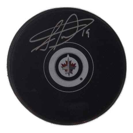 Winnipeg Jets logo hockey puck. Hand-signed by Jonathan Toews.