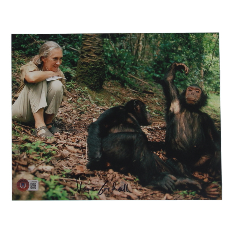 Photo measures 8" x 10" in size and has been hand-signed by Jane Goodall (D. 2025).