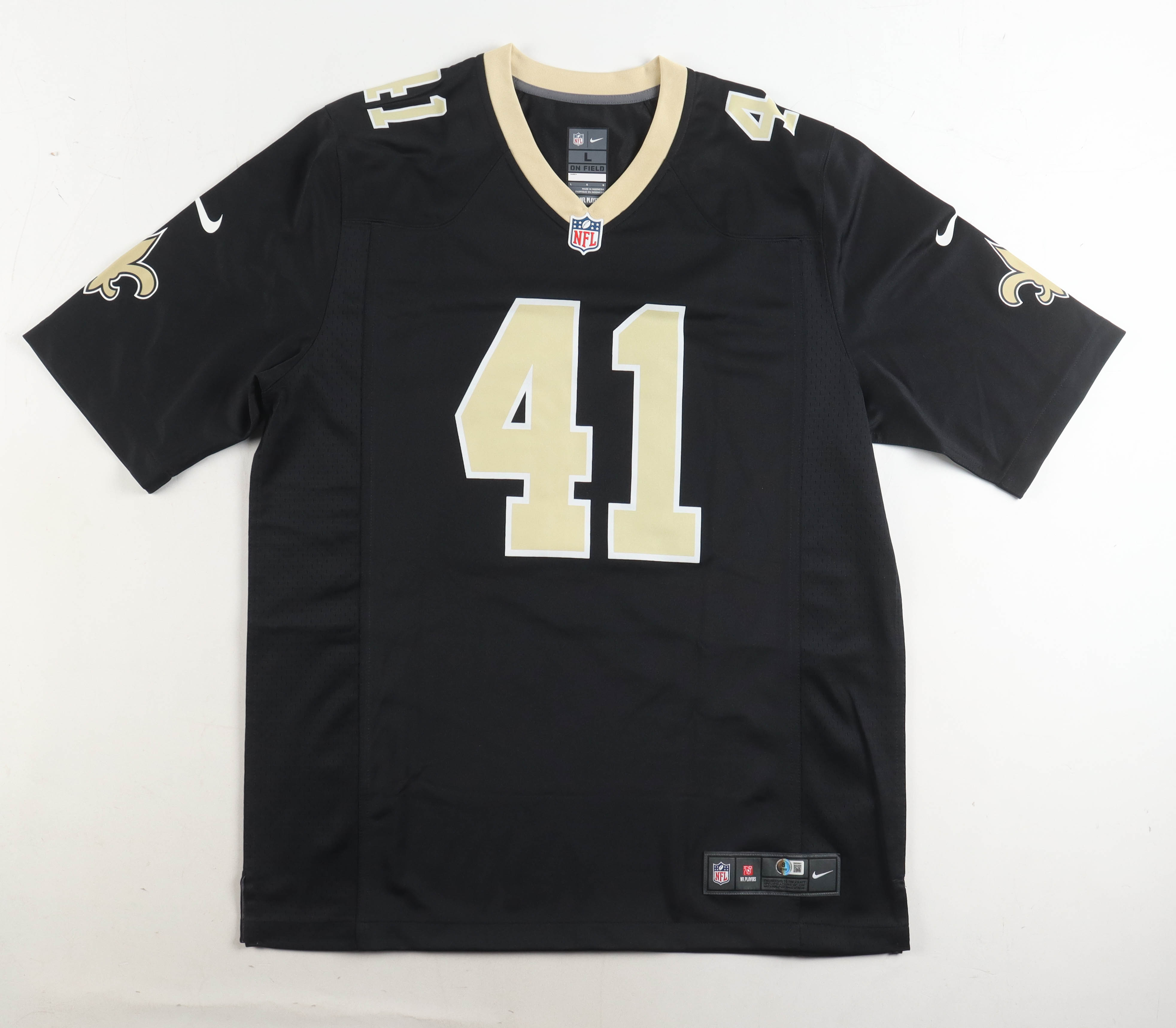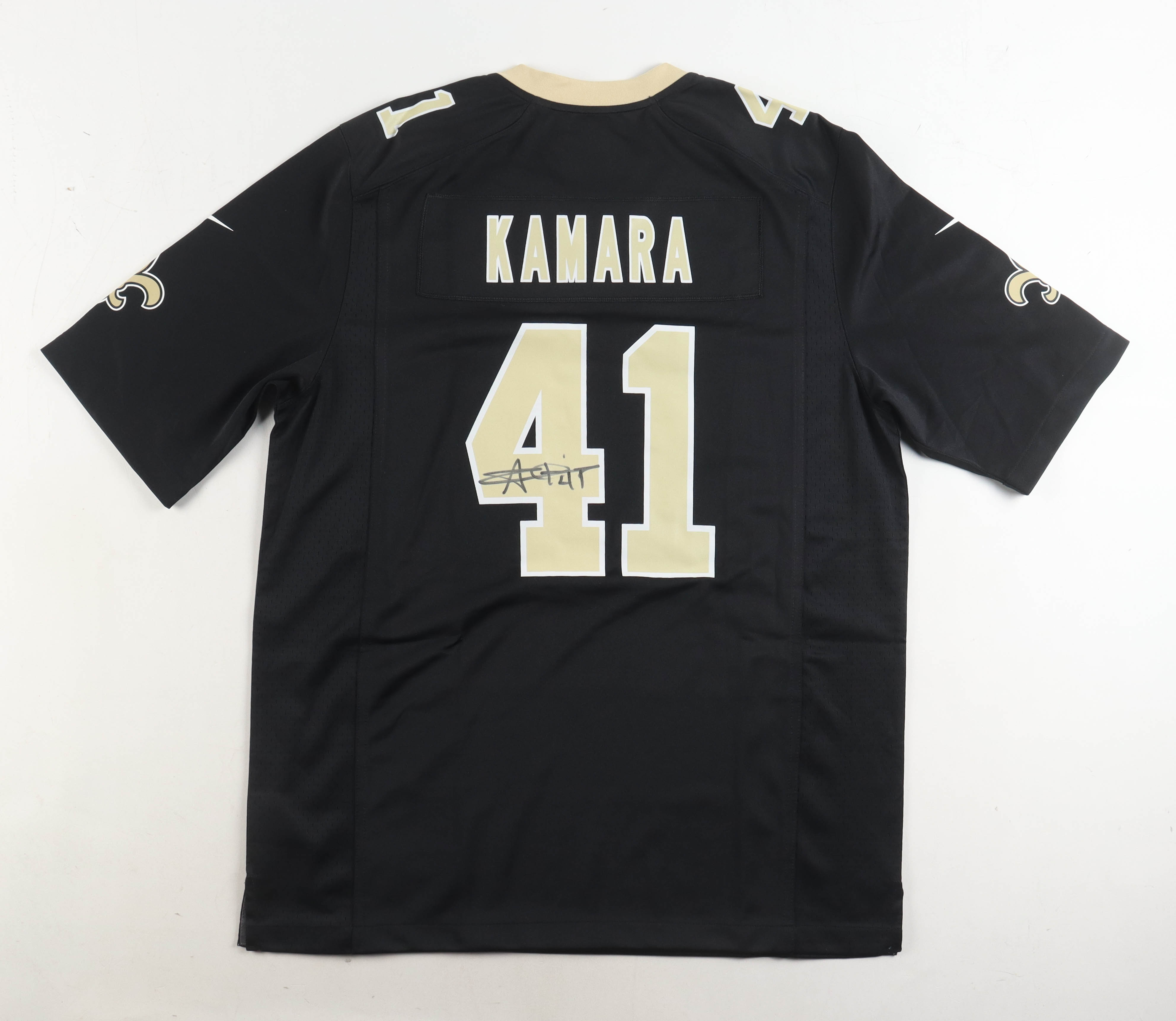 Custom jersey with everything pressed on, size L. Hand-signed by Alvin Kamara (New Orleans Saints).