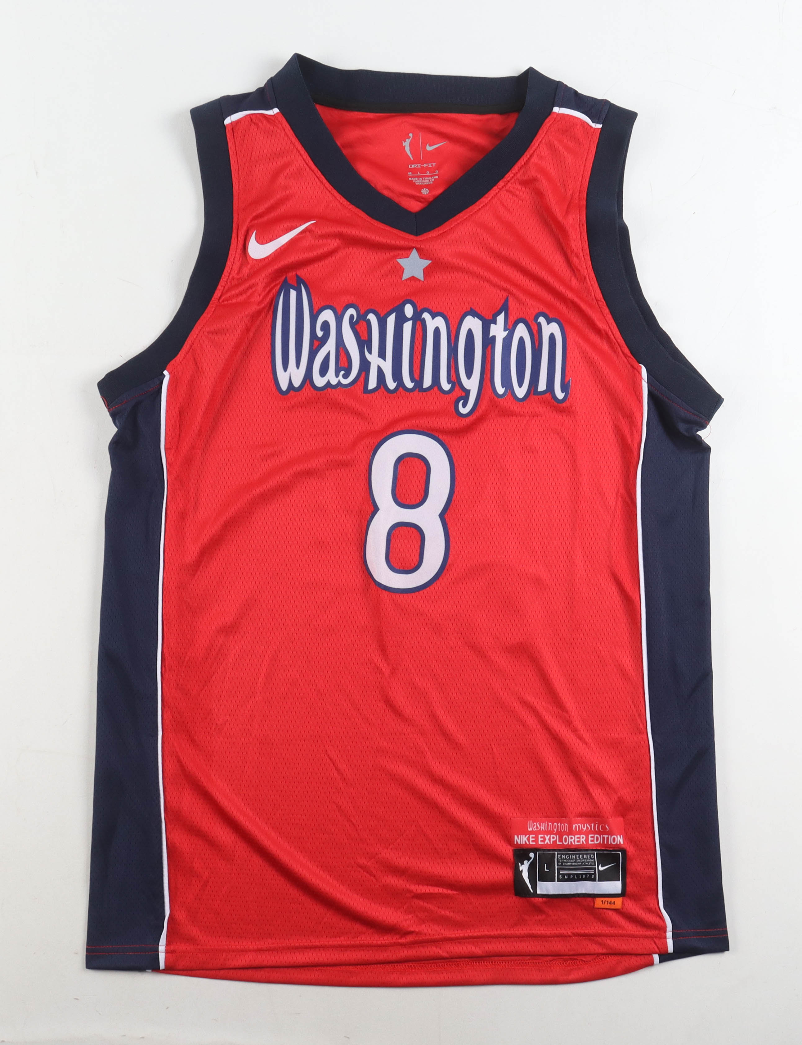 Nike authentic jersey with everything pressed on, size L. Hand-signed by Georgia Amoore (Washington Mystics).
