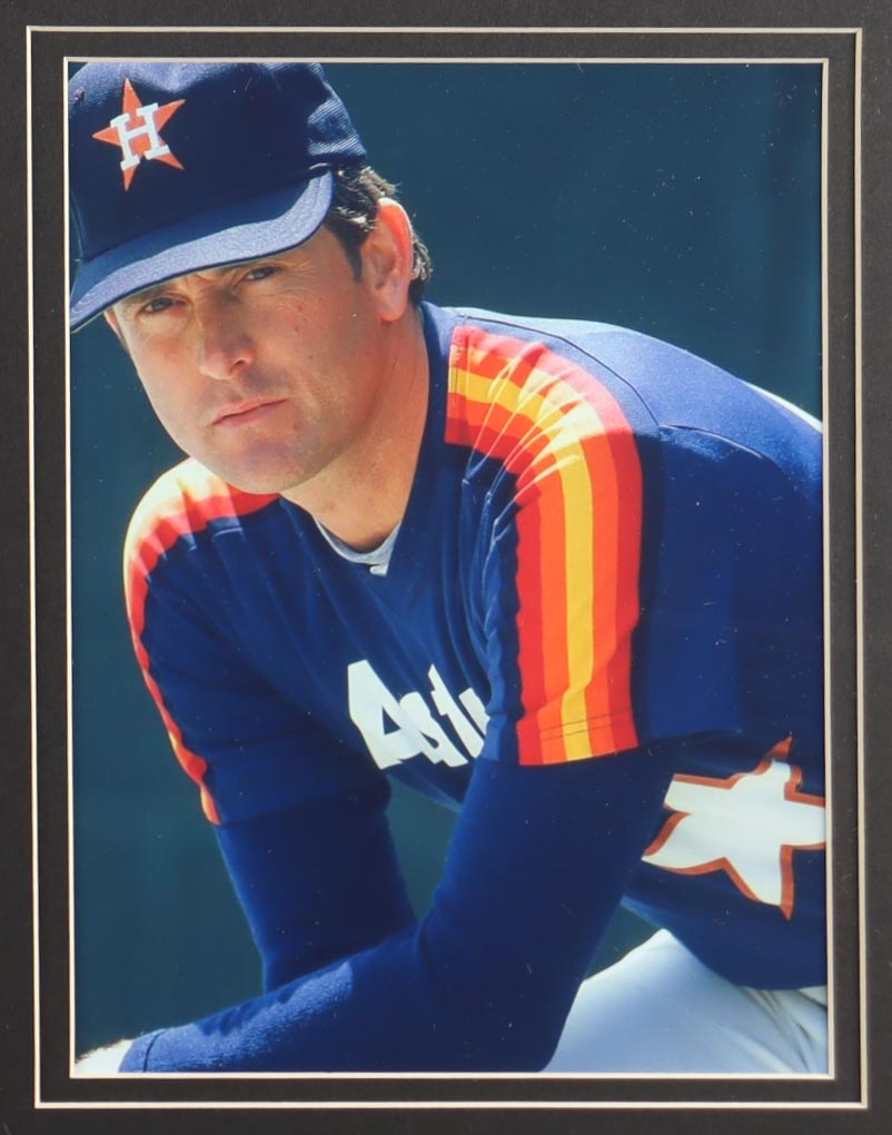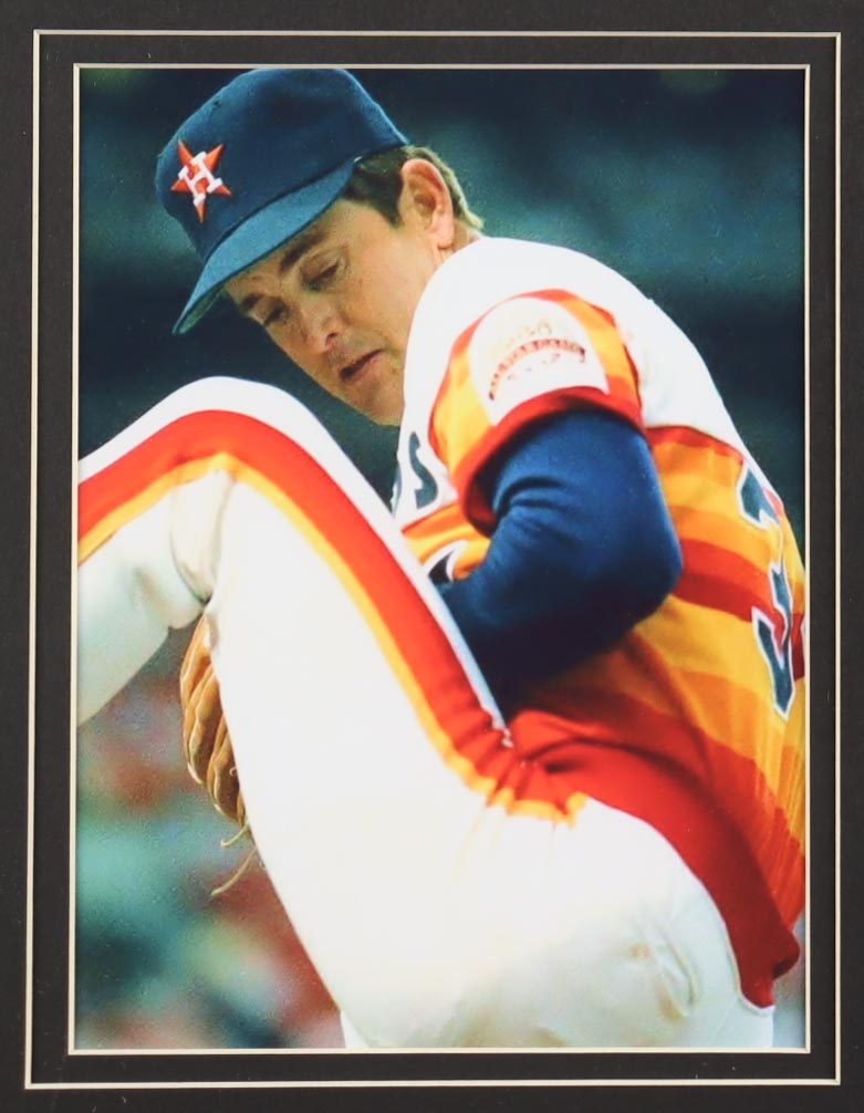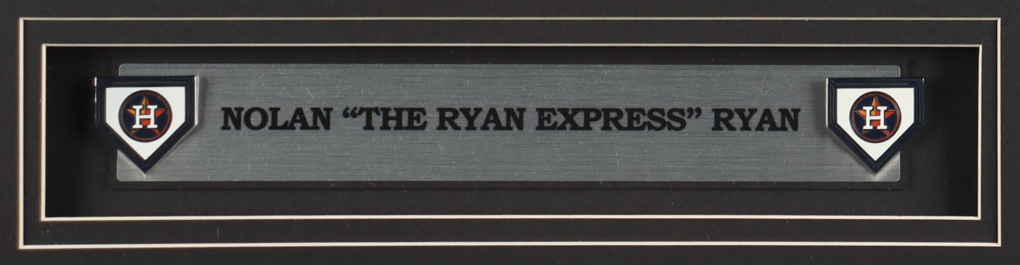 Custom frame display measures approximately 32" x 36" in size and features a jersey that has been hand-signed and inscribed by Nolan Ryan (Houston Astros, HOF). The display also includes a (2) Astros logo pins, (2) photos and (2) cloth team logo patches and a career statistics plaque.