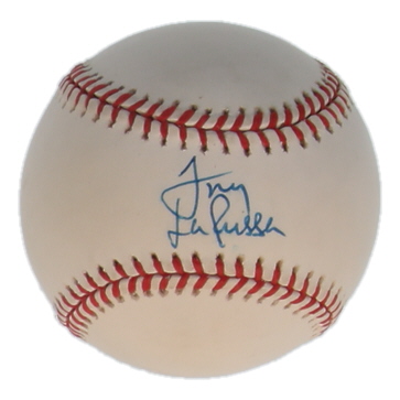 Rawlings Official National League baseball. Hand-signed and inscribed by Tony La Russa (St. Louis Cardinals, HOF). Please note, baseball is naturally toned and stained.