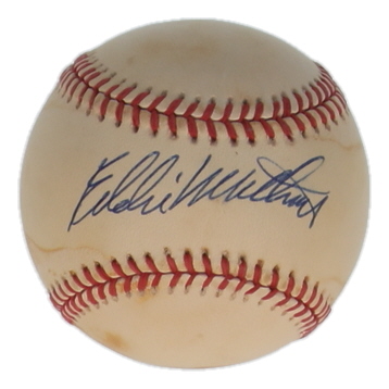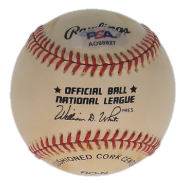 Rawlings Official National League Baseball. Hand-signed by Eddie Mathews (D.2001, Atlanta Braves, HOF). Please note, ball has been stained and naturally toned.