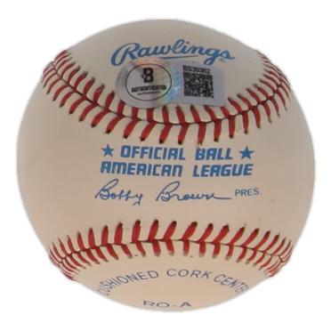 Rawlings Official American League baseball. Hand-signed by Harmon Killebrew (D. 2011, Minnesota Twins, HOF). Please note, the ball is naturally toned and stained throughout.
