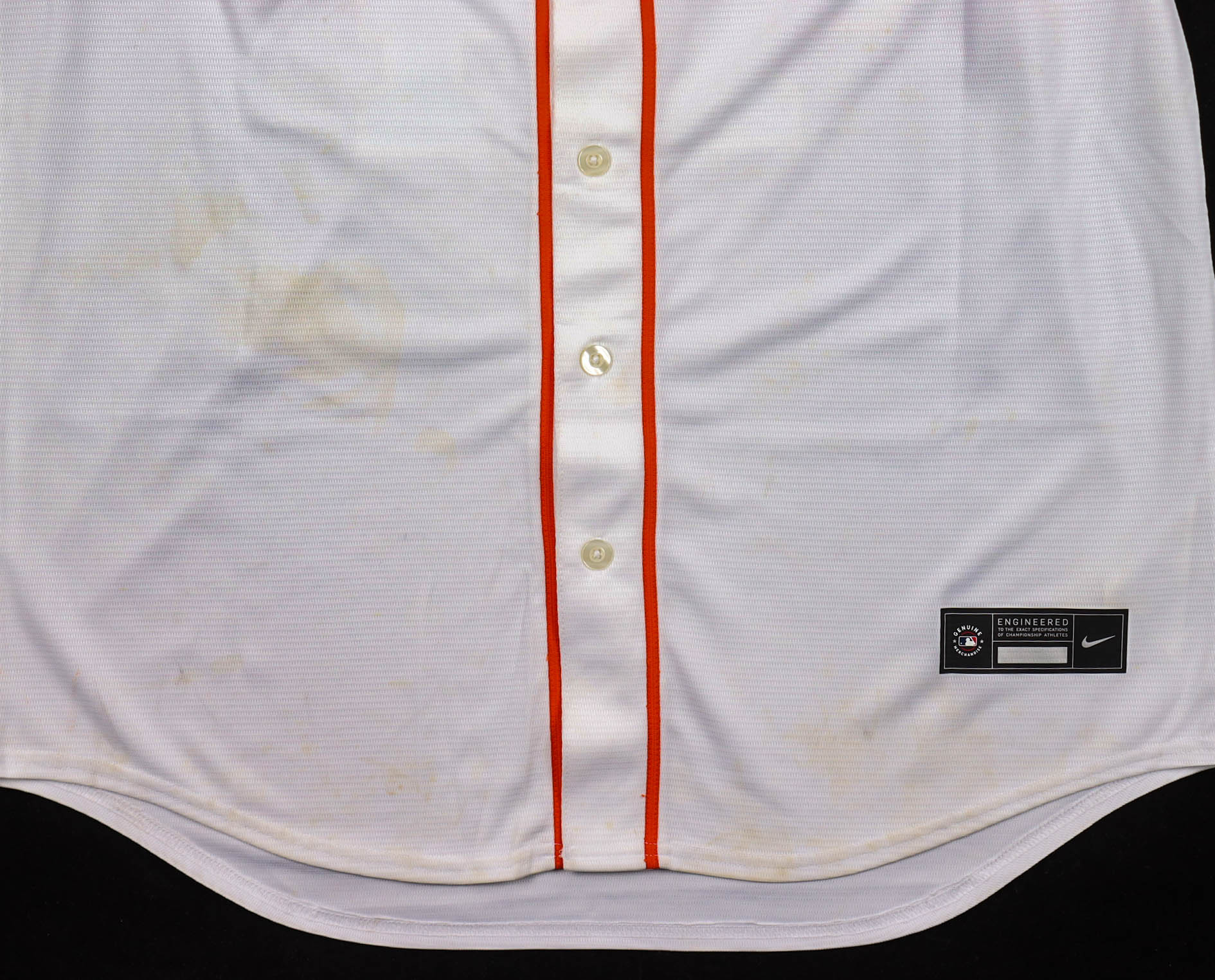Nike jersey with everything pressed on, size L. Hand-signed and inscribed by Reggie Jackson (HOF). Please note, there is staining throughout the jersey. See photos regarding the condition of the item.