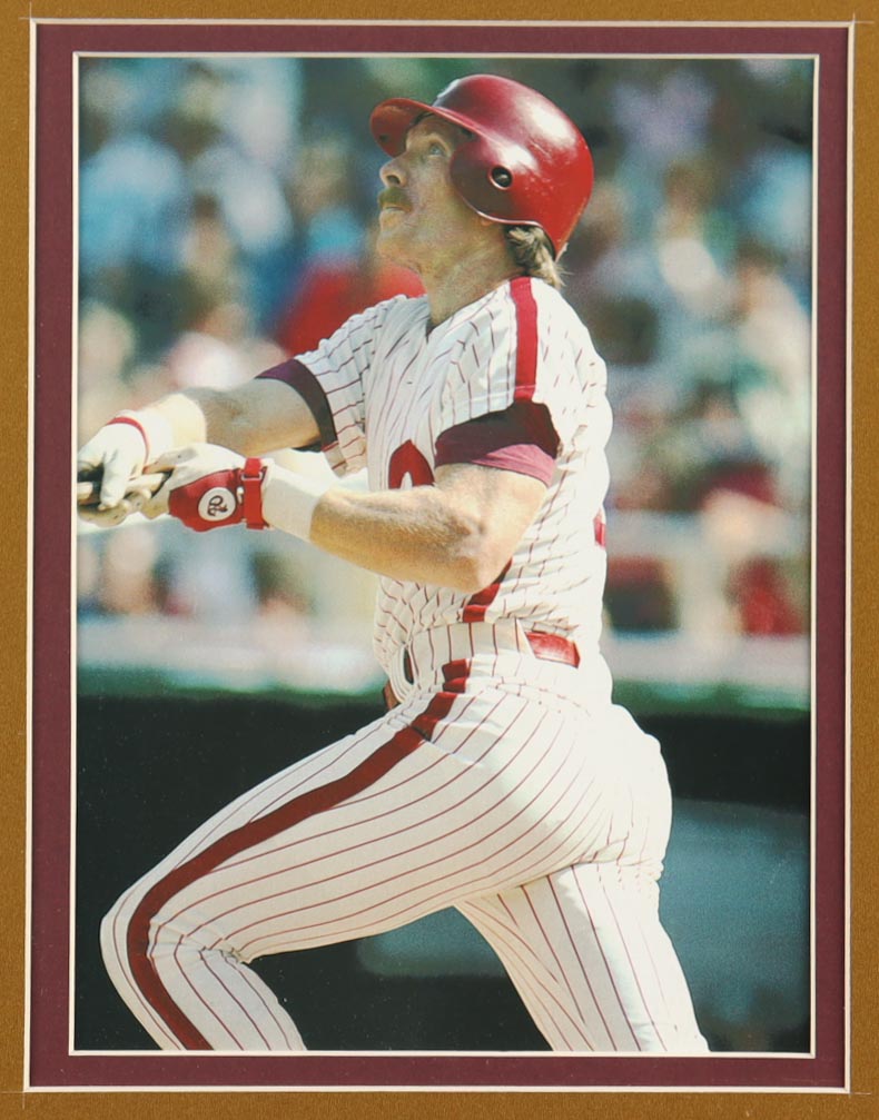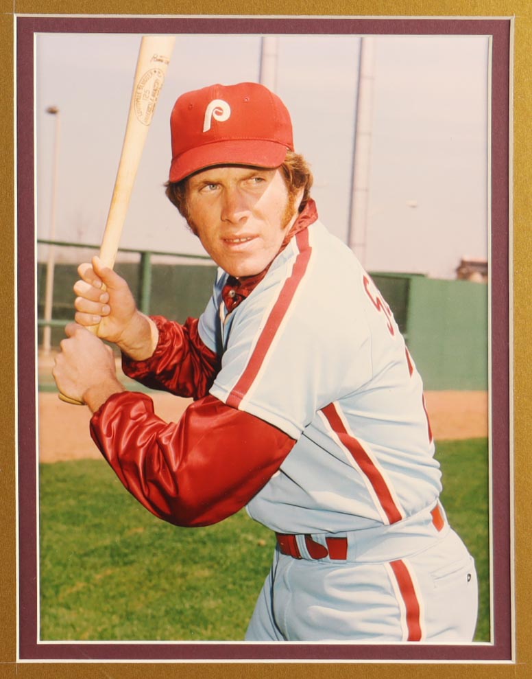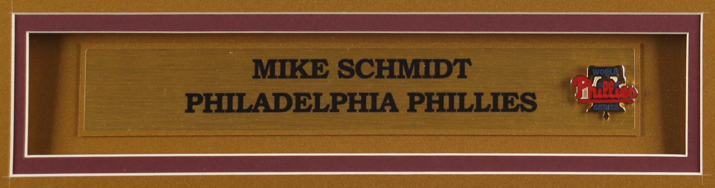 Custom frame display measures approximately 32" x 36" in size and features a jersey that has been hand-signed by Mike Schmidt (Philadelphia Phillies, HOF). The display also includes a World Series logo pin, (2) photos and (2) cloth team logo patches and a career statistics plaque.