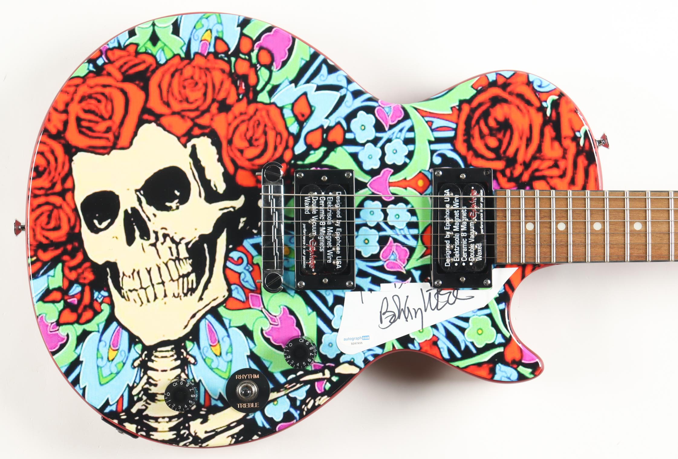 Custom Grateful Dead Les Paul-style guitar measures approximately 39" in length and has been hand-signed on the pickguard by Bobby Weir (lead singer & guitarist).