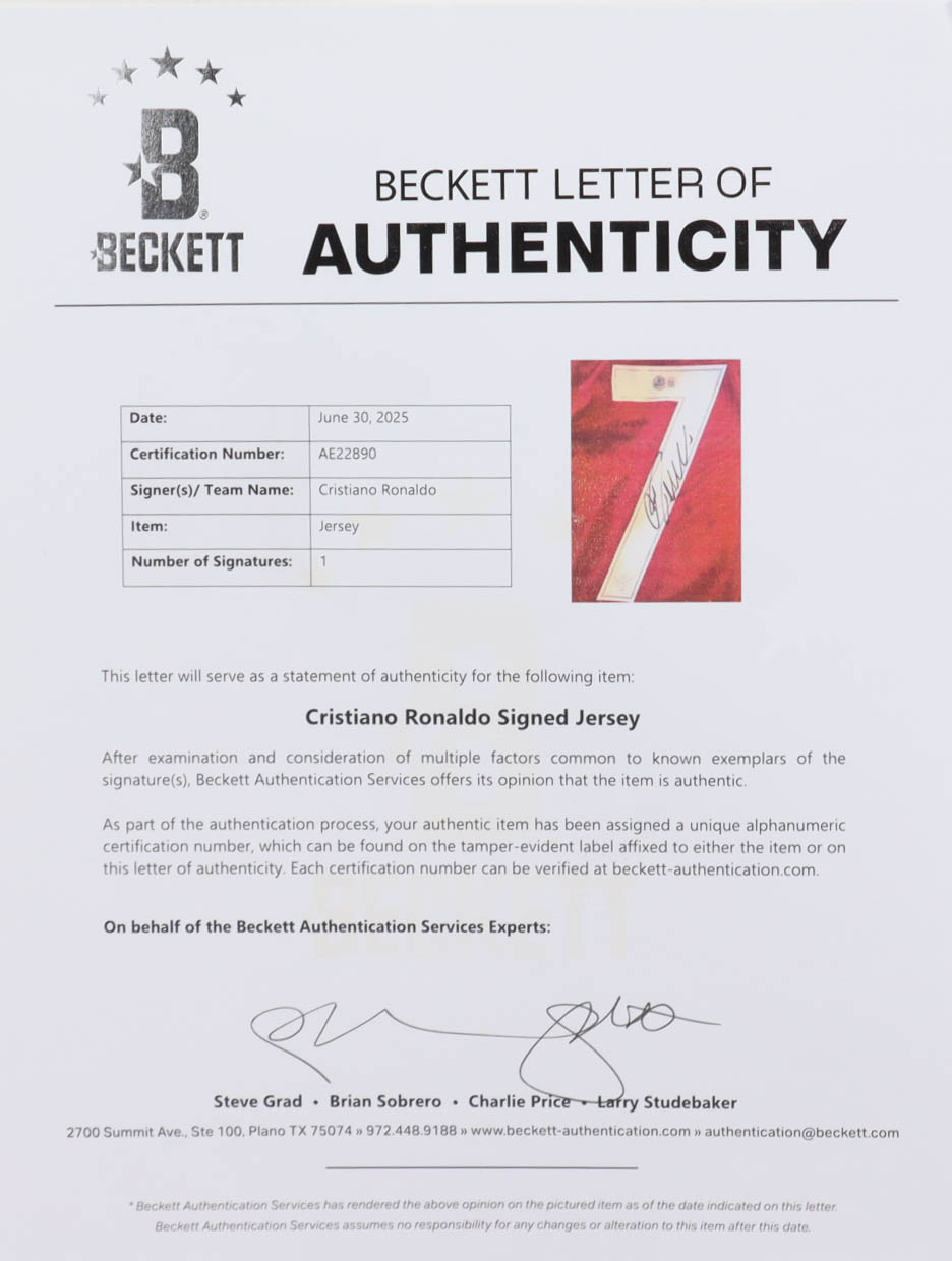 Nike authentic jersey with everything pressed on, size L. Hand-signed by Cristiano Ronaldo.