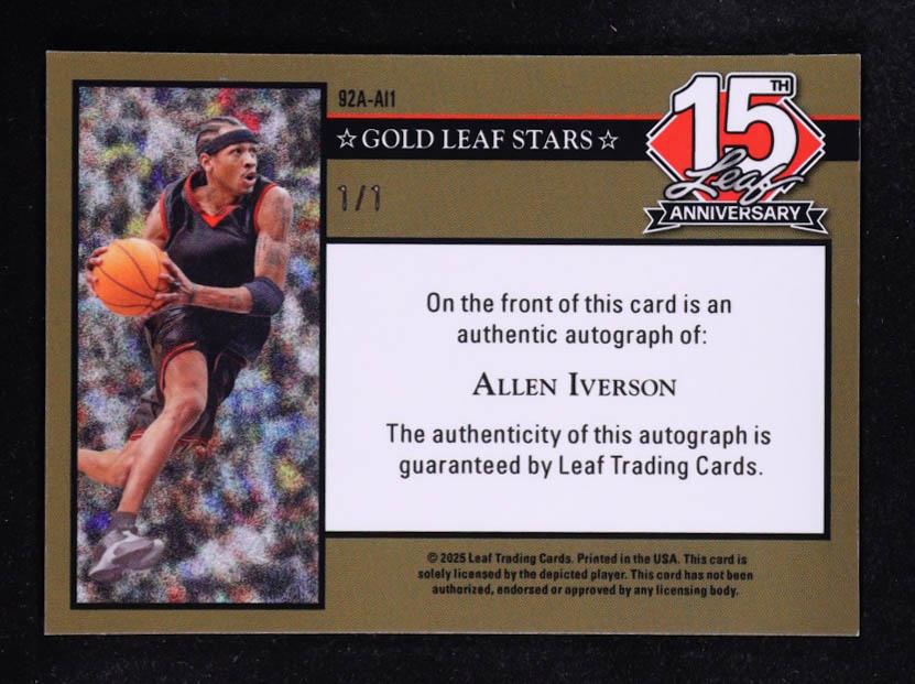 Allen Iverson 2025 Leaf Gold Leaf Stars 15th Anniversary Autographs #92A-AI1 #1/1