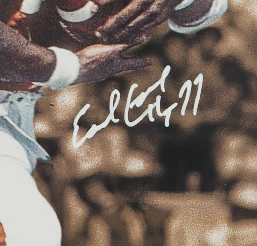 Custom frame measures approximately 22" x 26" in size and features a photo that has been hand-signed and inscribed by Earl Campbell (HOF). Please note, there is minor scuffing throughout the frame.