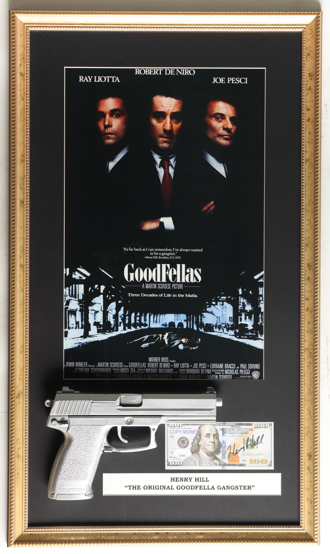 Henry Hill Signed "Goodfellas" Custom Framed $100 Bill Movie Prop Money Display with Poster Print & Replica Prop Pistol (JSA)