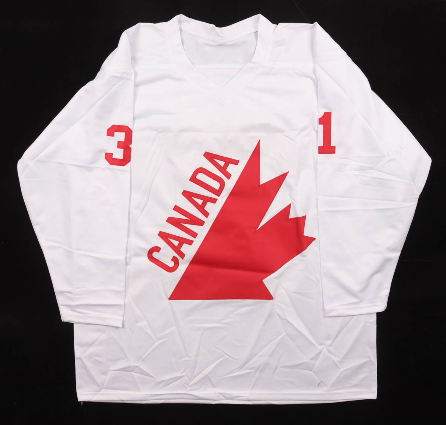 Custom jersey with everything sewn on, size XL. Hand-signed and inscribed by Gerry Cheevers (Team Canada, HOF).