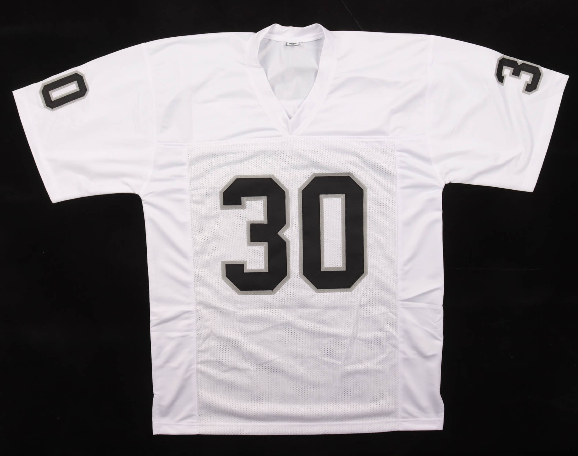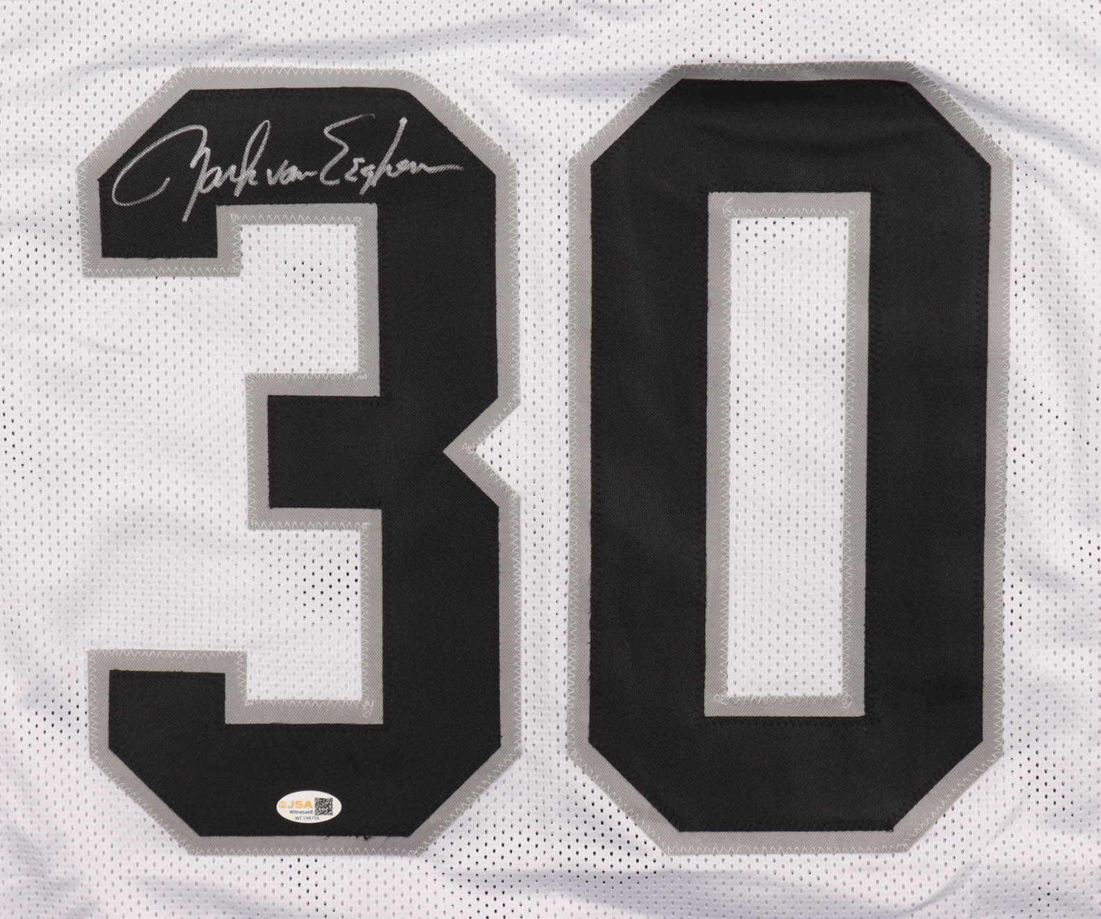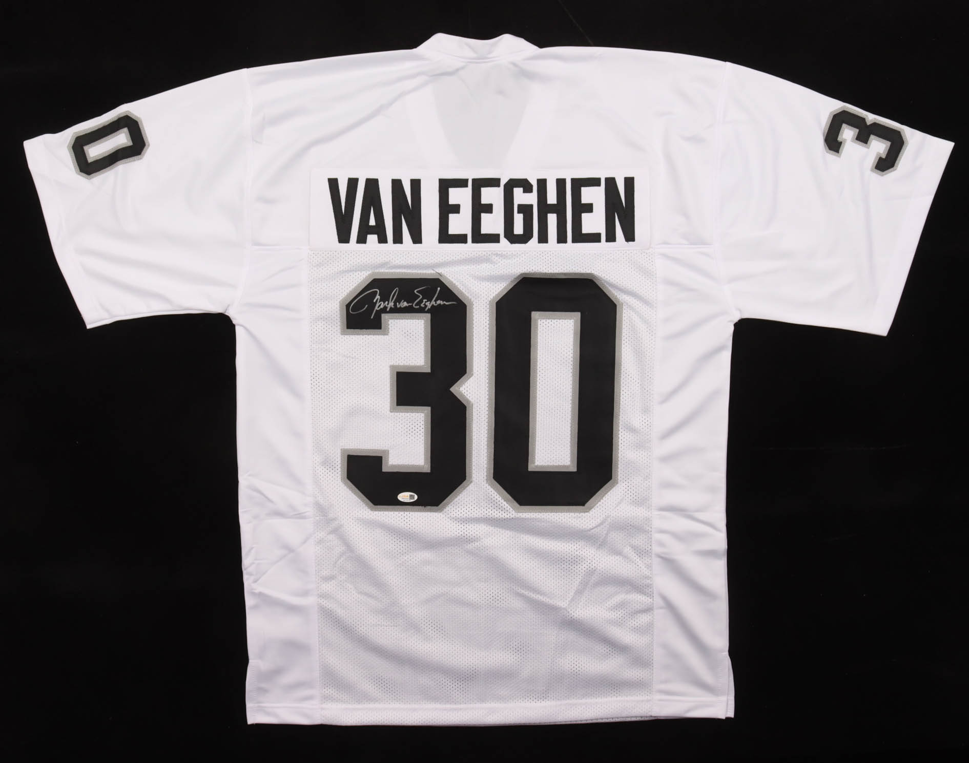 Custom jersey with everything sewn on, size XL. Hand-signed by Mark Van Eeghen (Oakland Raiders).