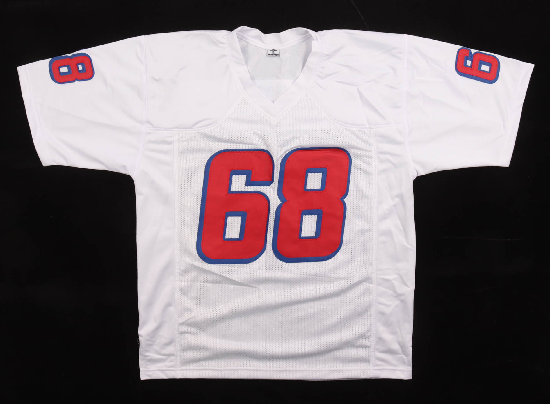Custom jersey with everything sewn on, size XL. Hand-signed and inscribed by Max Lane (New England Patriots).