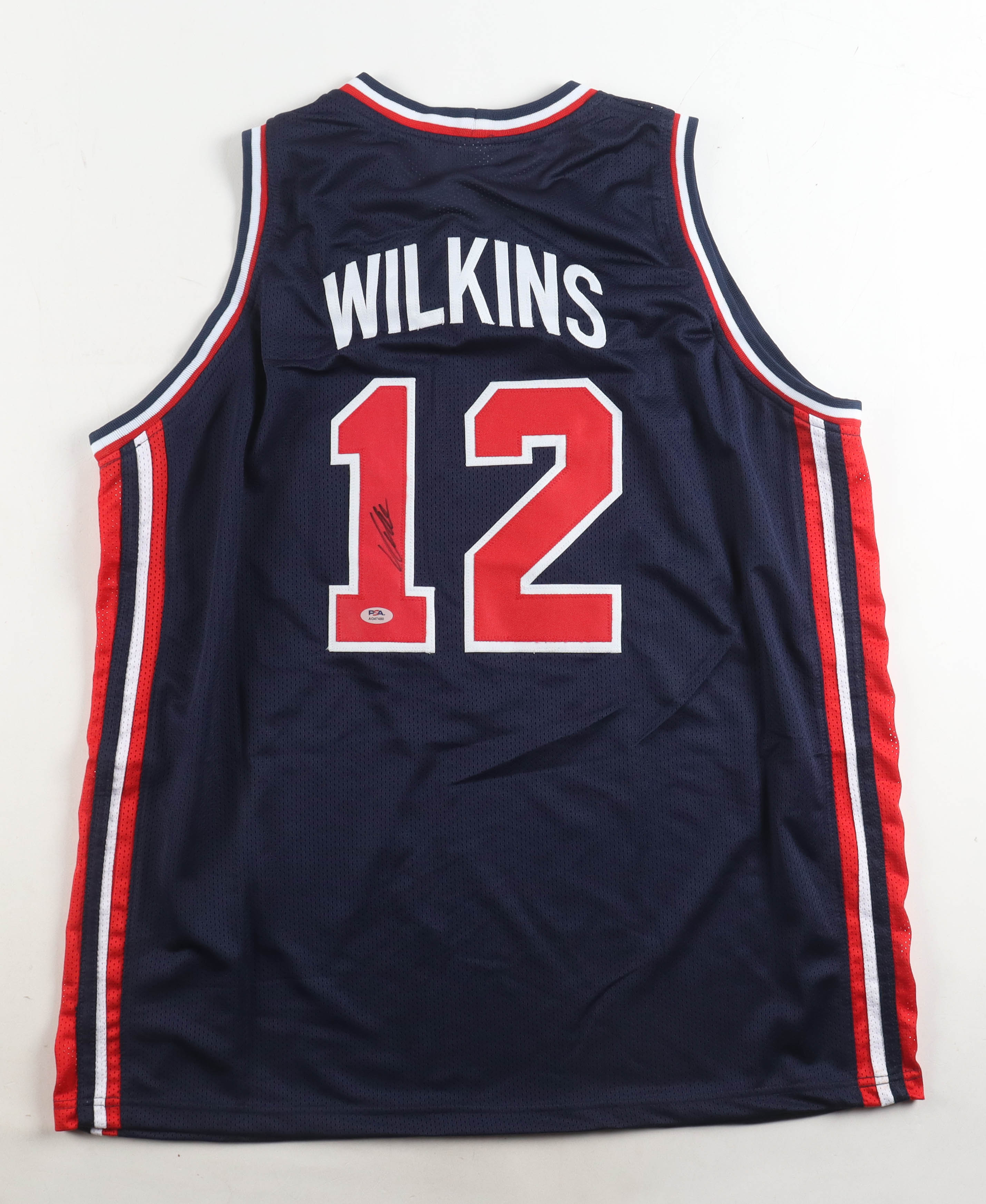 Custom jersey with everything sewn on, size XL. Hand-signed by Dominique Wilkins.