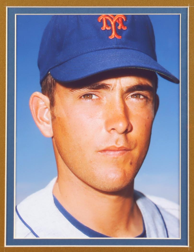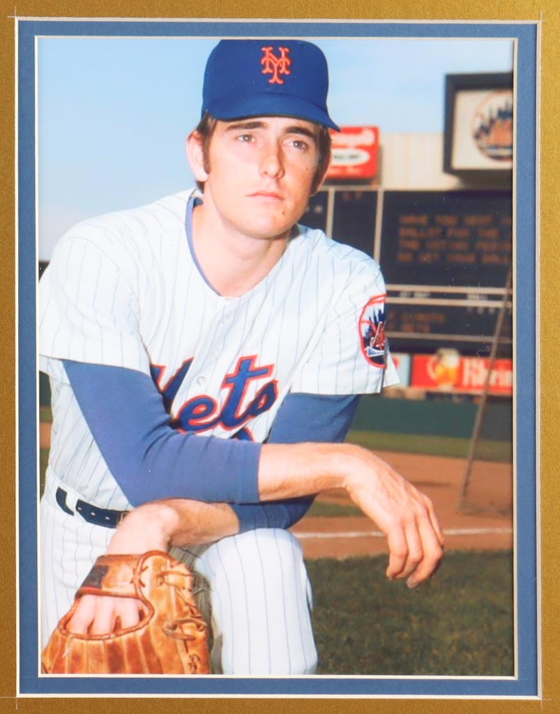 Custom frame display measures approximately 32" x 36" in size and features a jersey that has been hand-signed and inscribed by Nolan Ryan (New York Mets, HOF). The display also includes a vintage Mets World Series pin, (2) photos, cloth logo patch and a career statistics plaque.