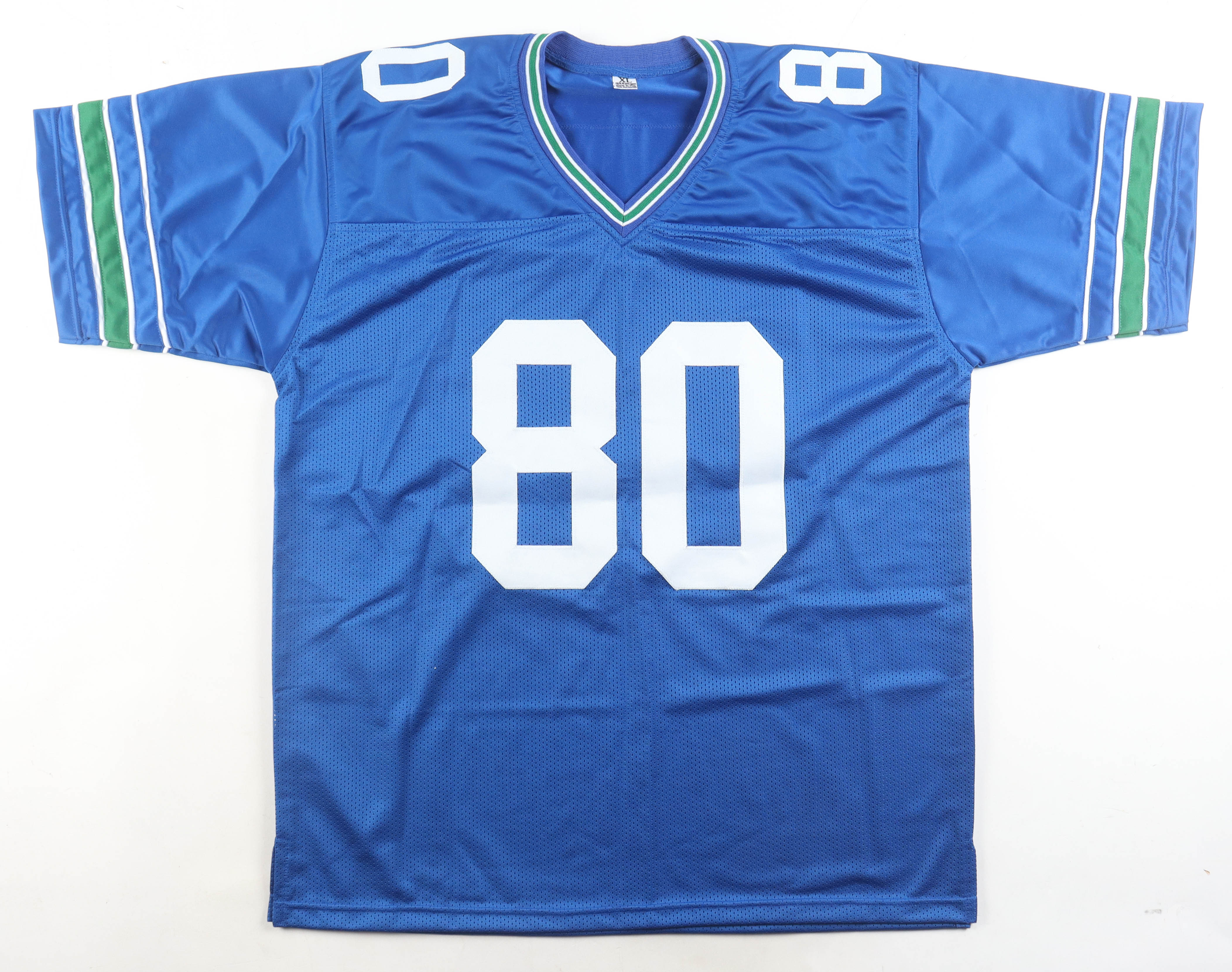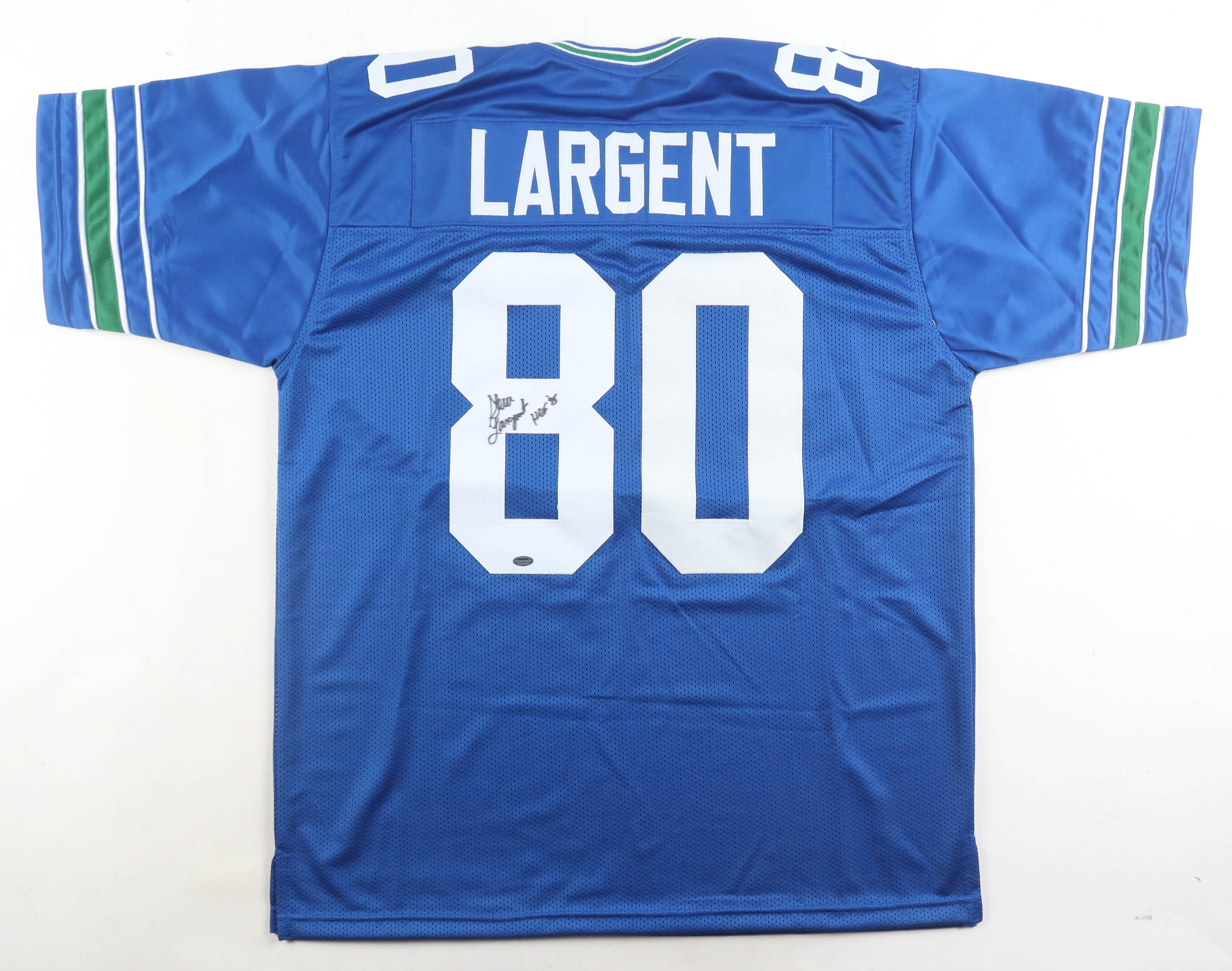 Custom jersey with everything sewn on, size XL. Hand-signed and inscribed by Steve Largent (HOF).