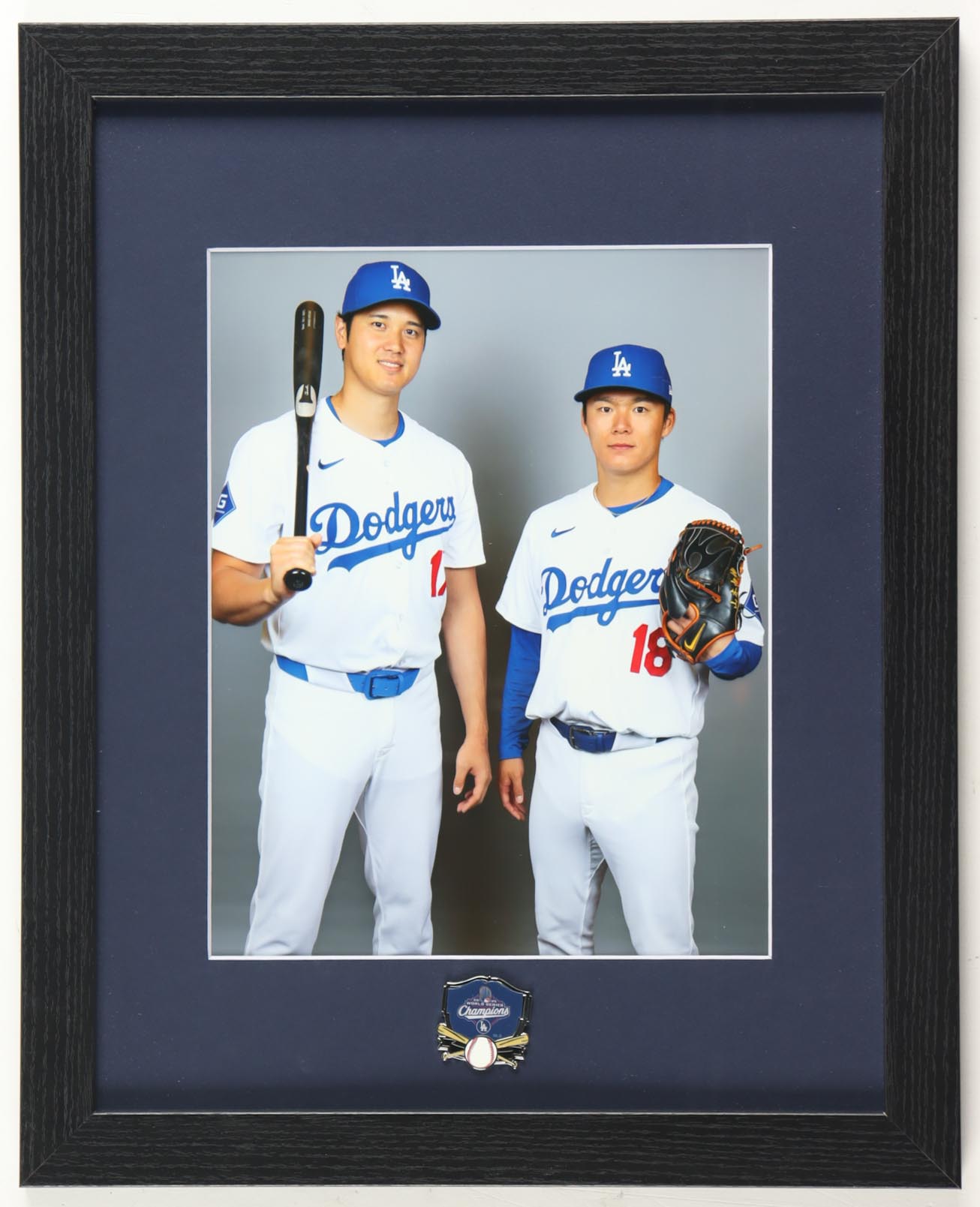 Custom frame measures approximately 13" x 16" in size and features a photo of Shohei Ohtani (Los Angeles Dodgers) & Yoshinobu Yamamoto (Los Angeles Dodgers). The display also features an official Los Angles World Series Champions pin. Please note, display is unsigned.