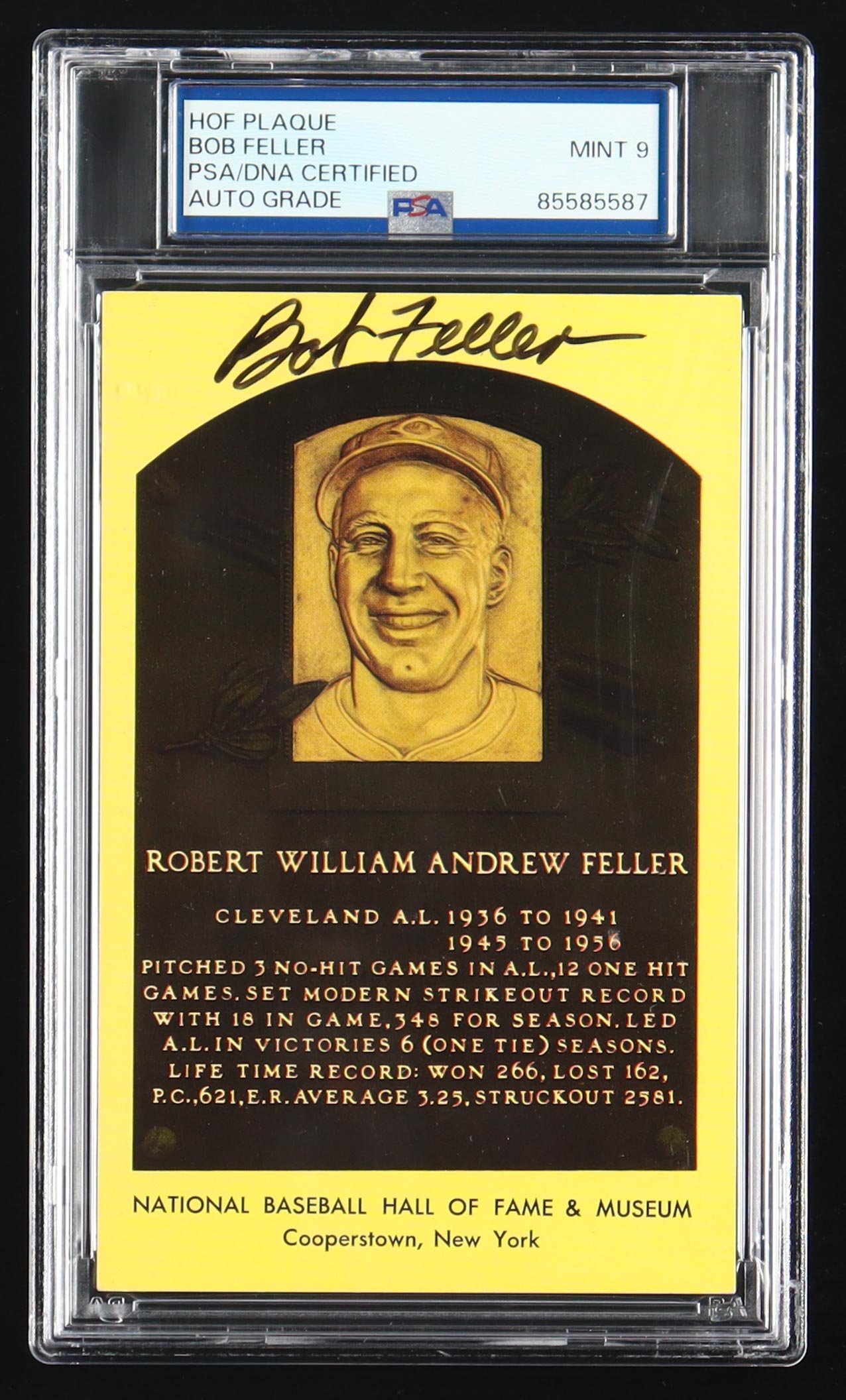 Bob Feller Signed Cut on Hall of Fame Plaque Postcard (PSA Auto 9)