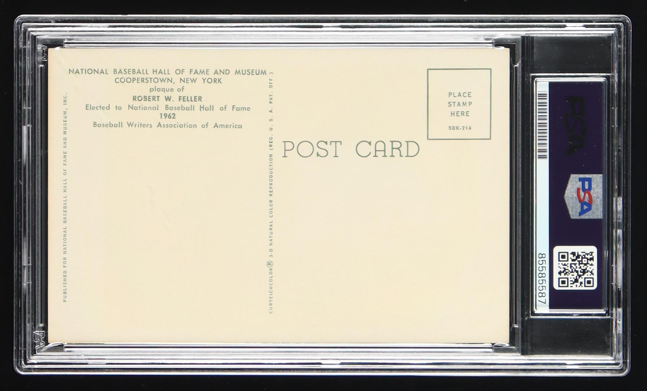 National Baseball Hall Of Fame Postcard that has been hand-signed by Bob Feller (D. 2010, Cleveland Indians, HOF) and has been graded (PSA) 9.
