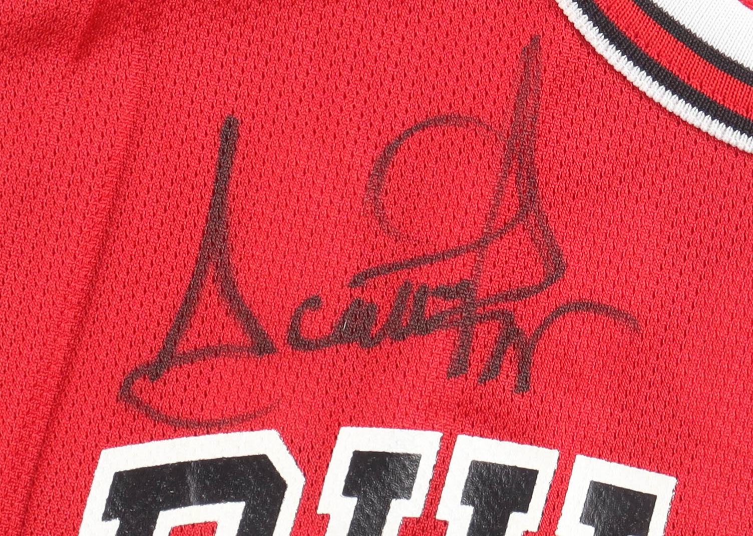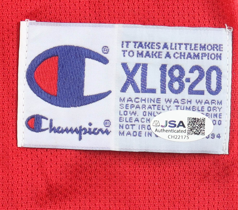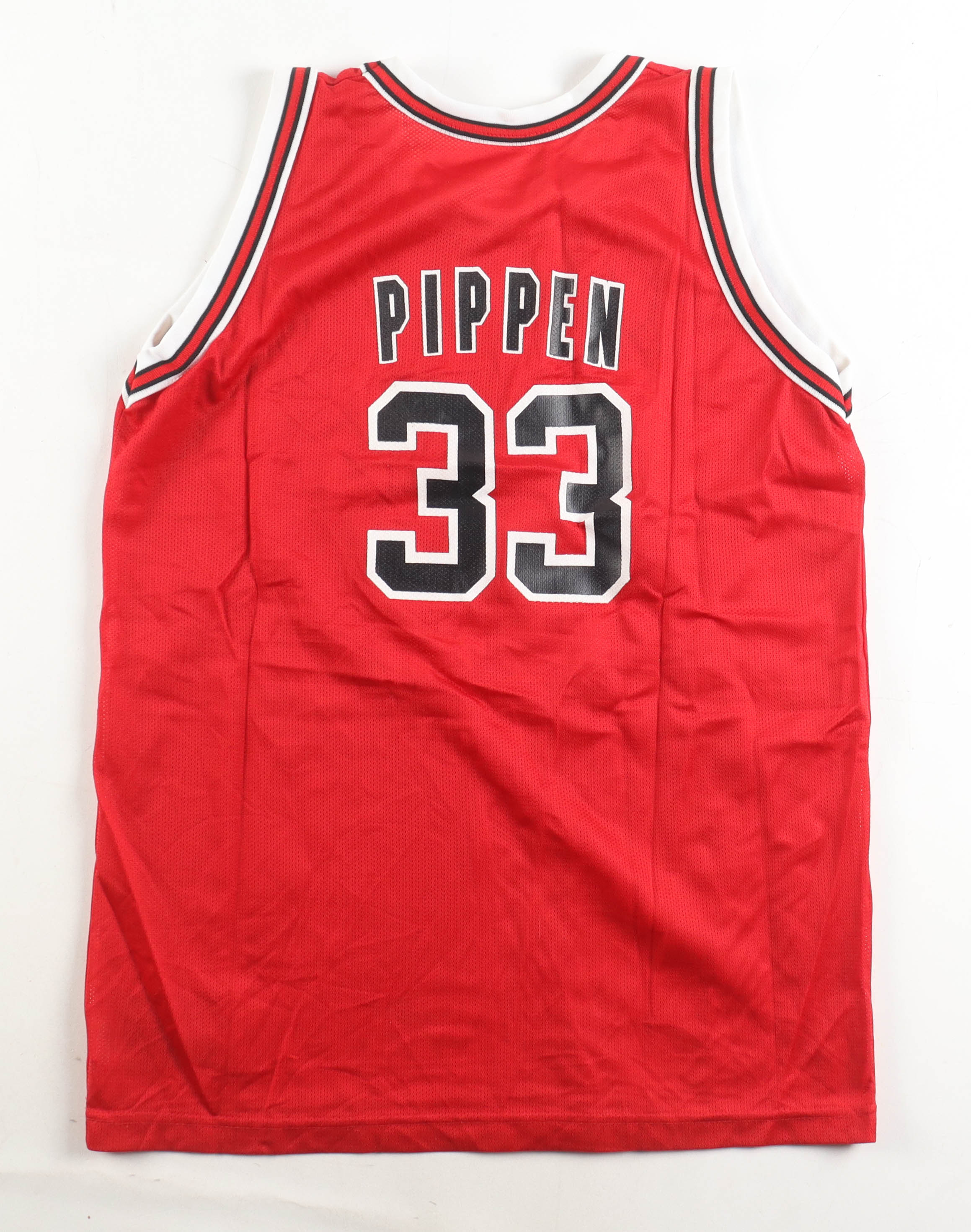 Champion authentic jersey with everything printed on, size XL 18-20. Has been hand-signed and inscribed by Scottie Pippen (Chicago Bulls, HOF).