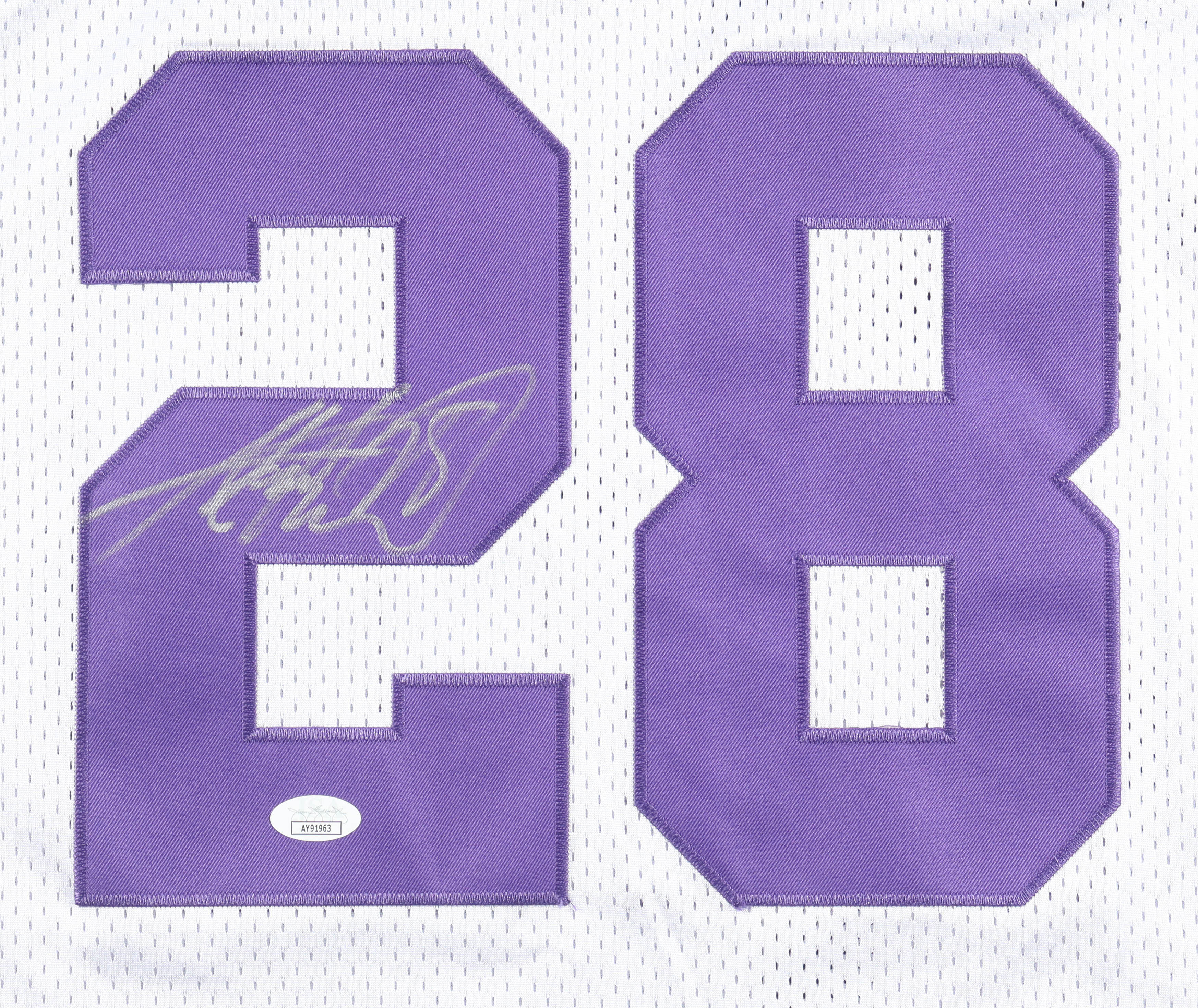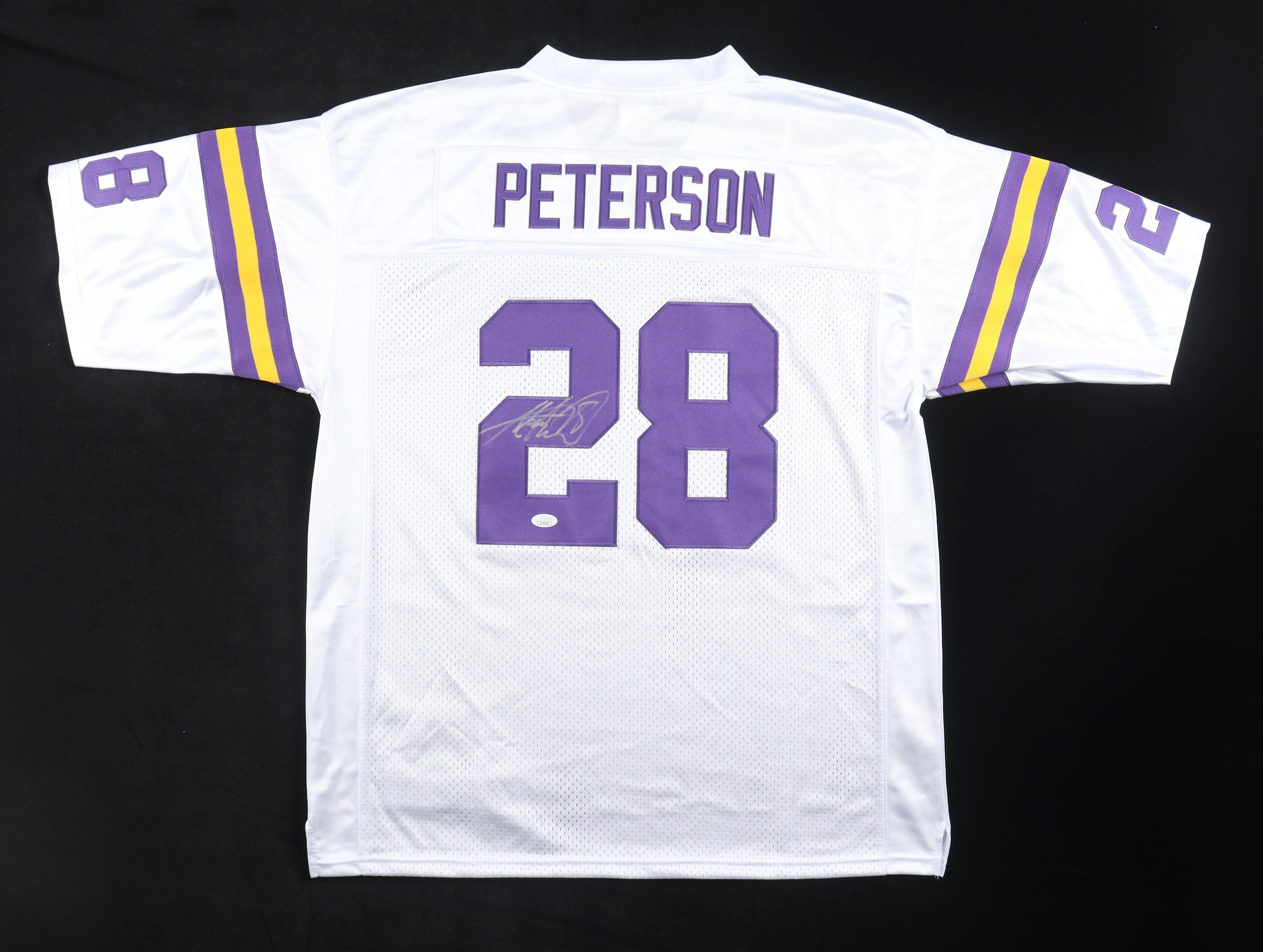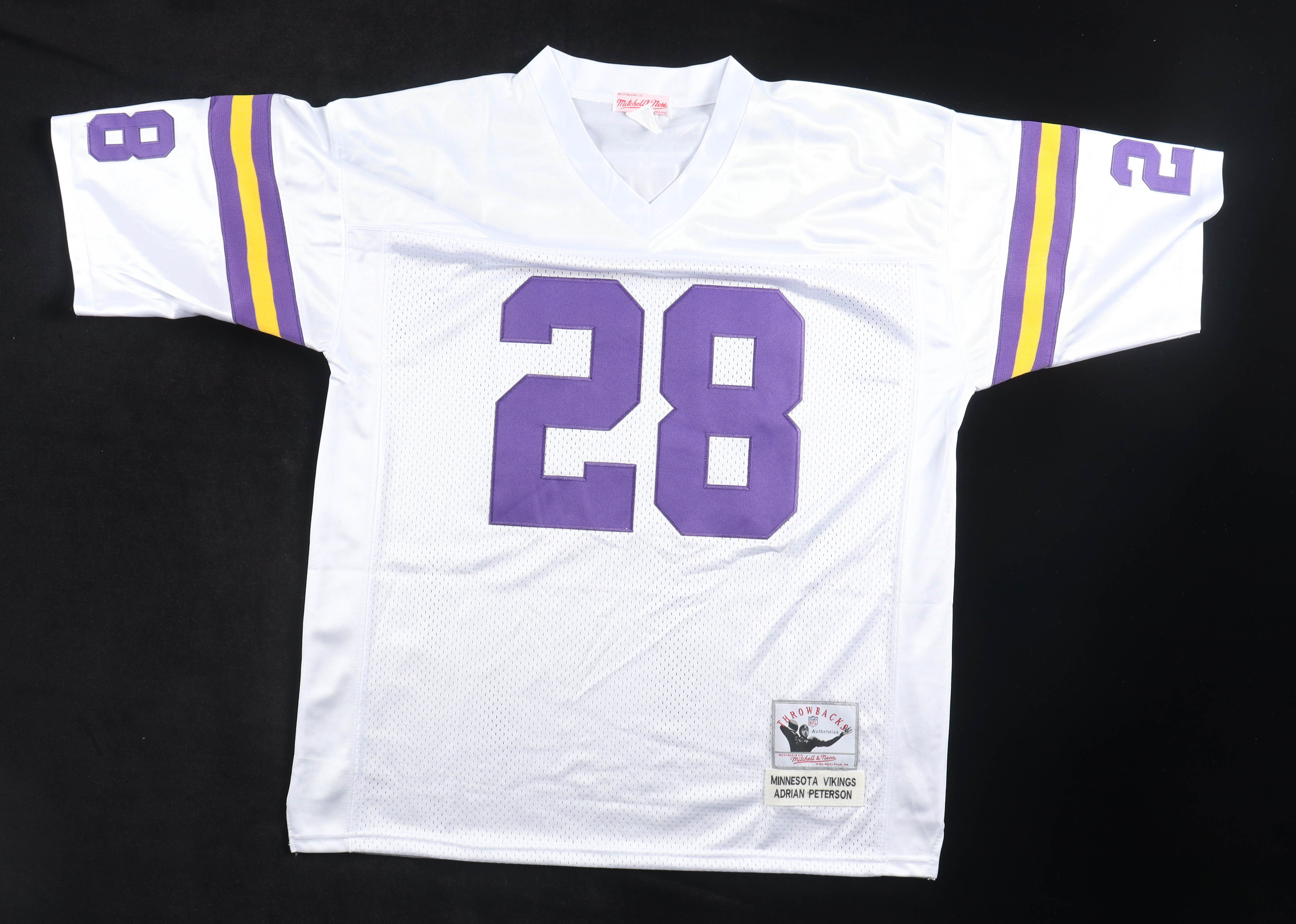 Mitchell & Ness authentic jersey with everything sewn on, size 50. Hand-signed by Adrian Peterson.