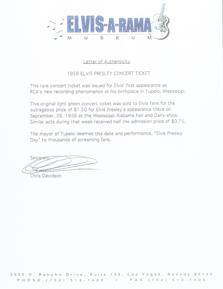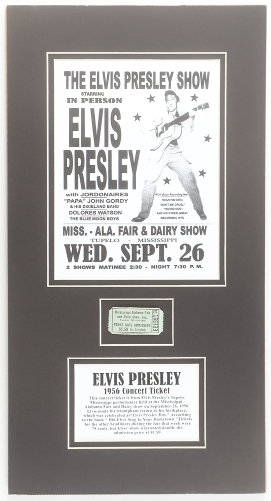 Custom matted display measures 9.5" x 19" in size and features an authentic ticket from a 1956 Concert in Tupelo, Mississippi dated Wednesday September 26. Includes a Letter of Authenticity outlining the provenance of the ticket.