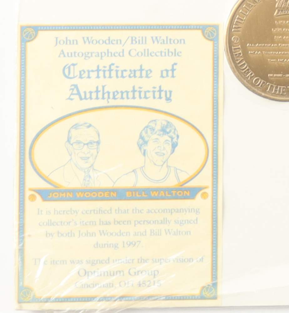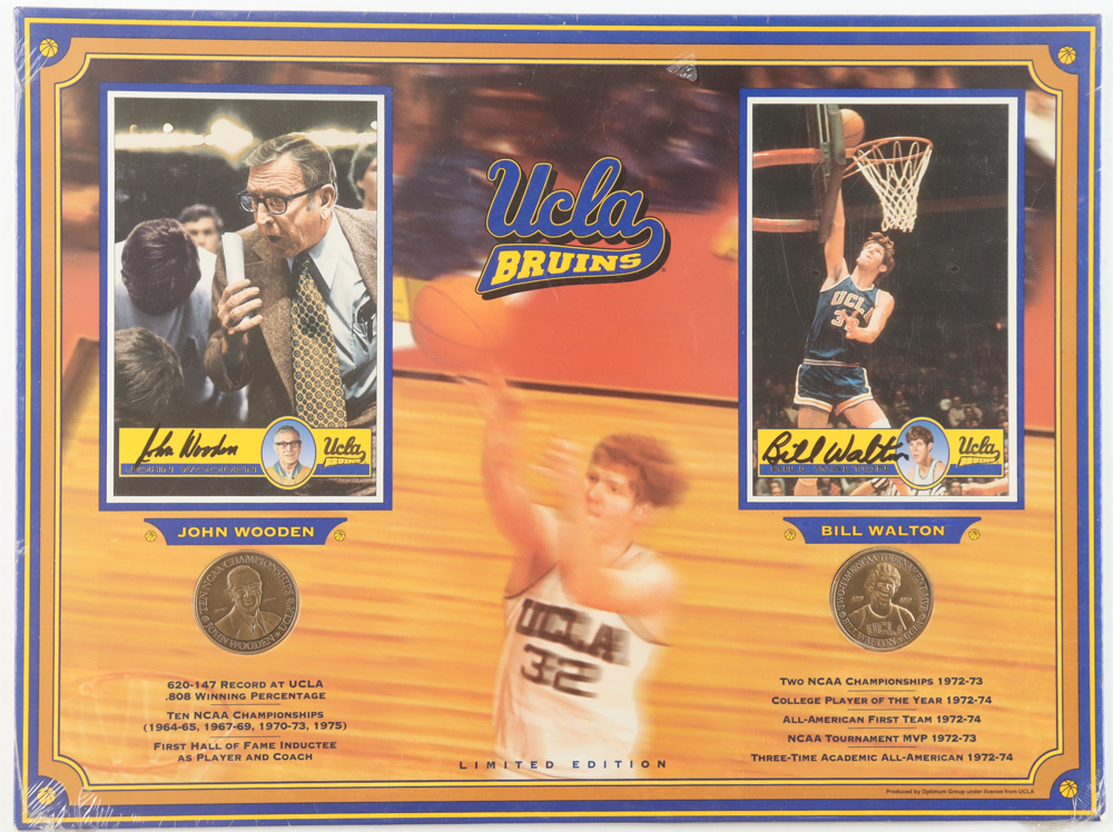 Custom display measures 12" x 16" in size and has been hand-signed by Bill Walton (HOF) and John Wooden (D. 2010, HOF). The display also includes 2 commemorative bronze coins and has been made limited edition.