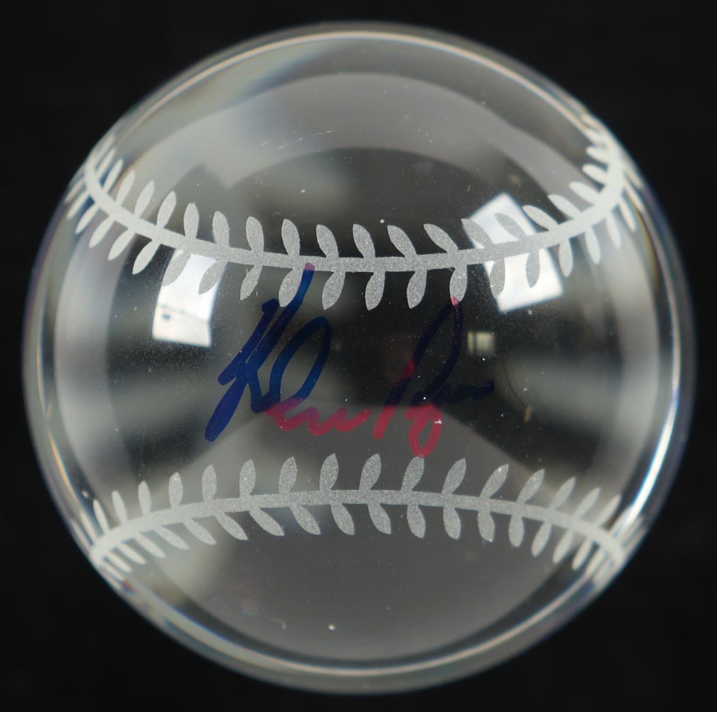 Tiffany & Co. Lead Crystal Baseball has been hand-signed by Nolan Ryan (Texas Rangers, HOF). Please see photos for details regarding the item. Display case is included as show.