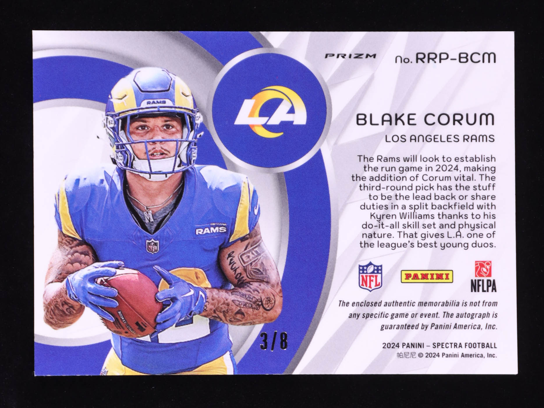 Blake Corum 2024 Panini Spectra Radiant Rookie Patch Signatures Neon Splatter #9 #3/8 RC