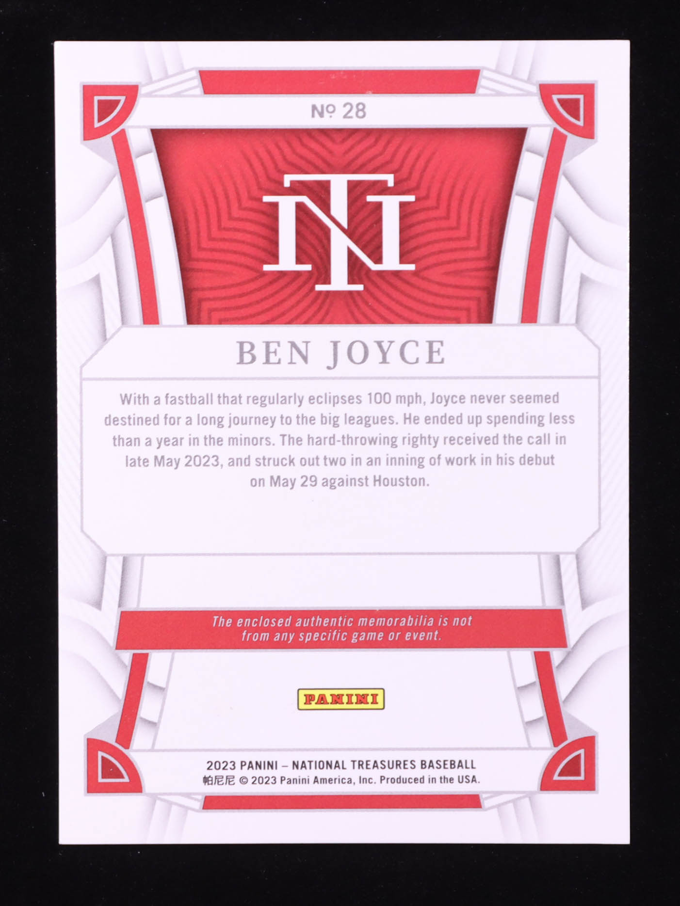 Ben Joyce 2023 Panini National Treasures Red White and Blue Materials Holo Silver #28 #02/10 RC