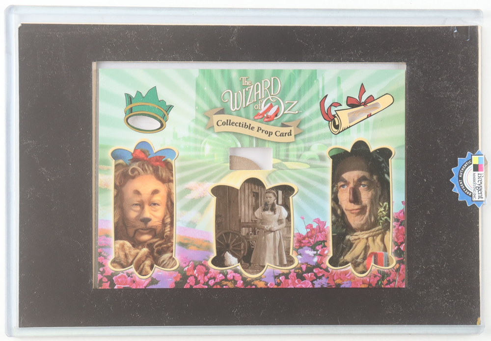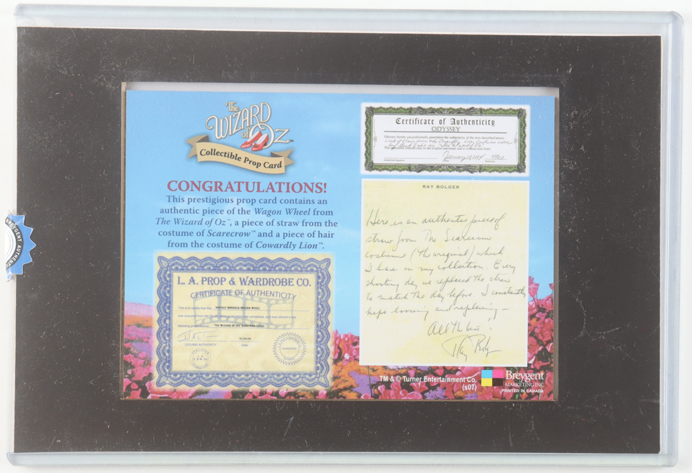 The Wizard Of Oz Collectible Prop Card. Prop card features a piece of hair from The Cowardly Lion, piece of wood from vintage Wagon Wheel and a piece of straw from Scarecrow.