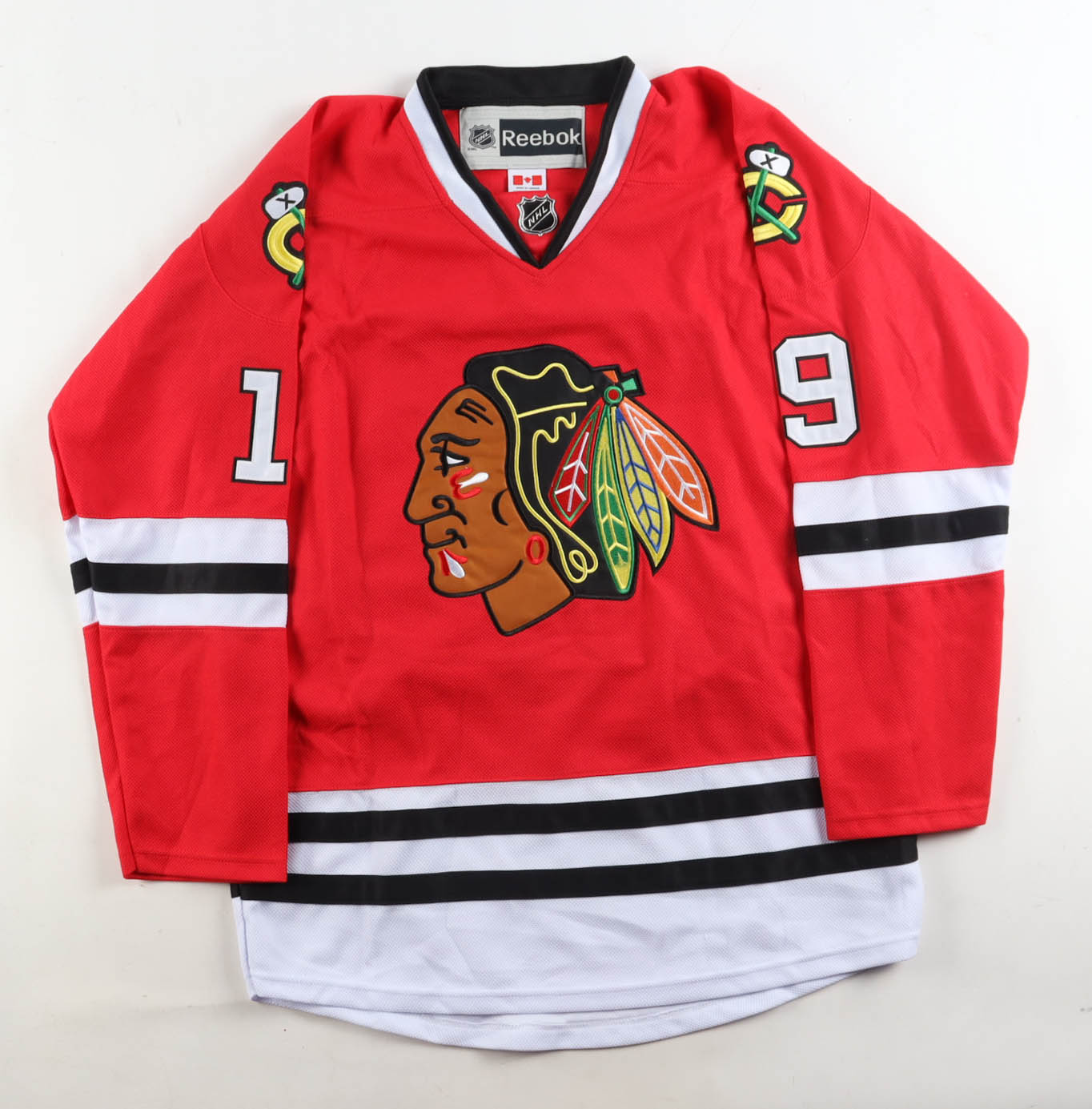 Reebok authentic jersey with everything sewn on, size 50. Hand-signed by Jonathan Toews (Chicago Blackhawks).