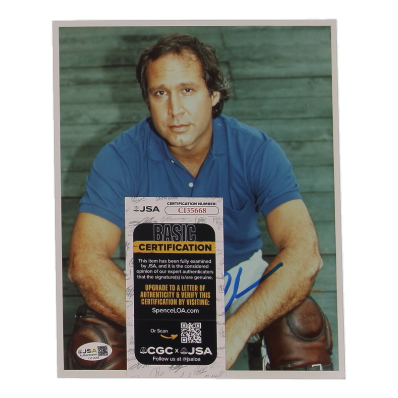 Photo measures 8" x 10" in size and has been hand-signed by Chevy Chase.