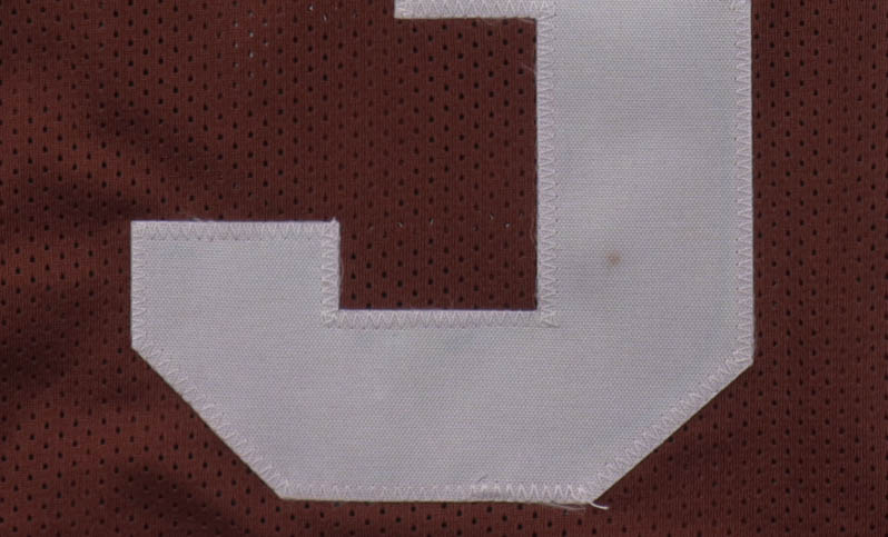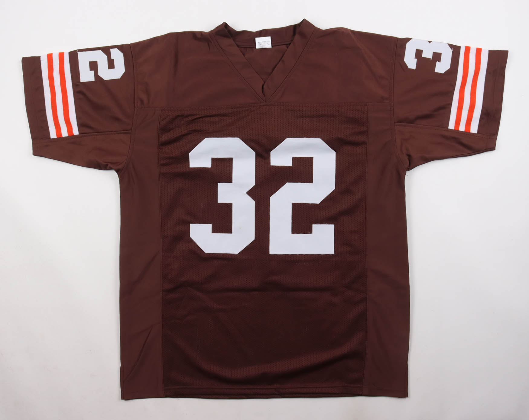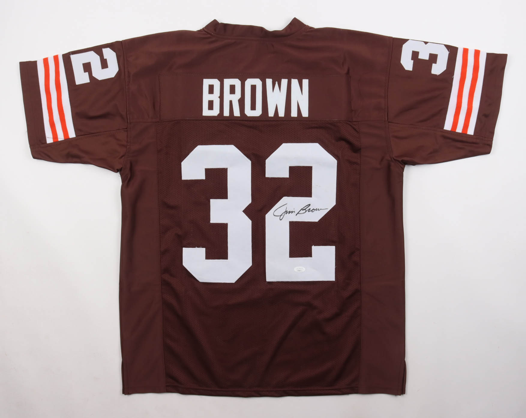 Custom jersey with everything sewn on, size XL. Hand-signed by Jim Brown (D. 2023, HOF). Please note, the front number is stained.