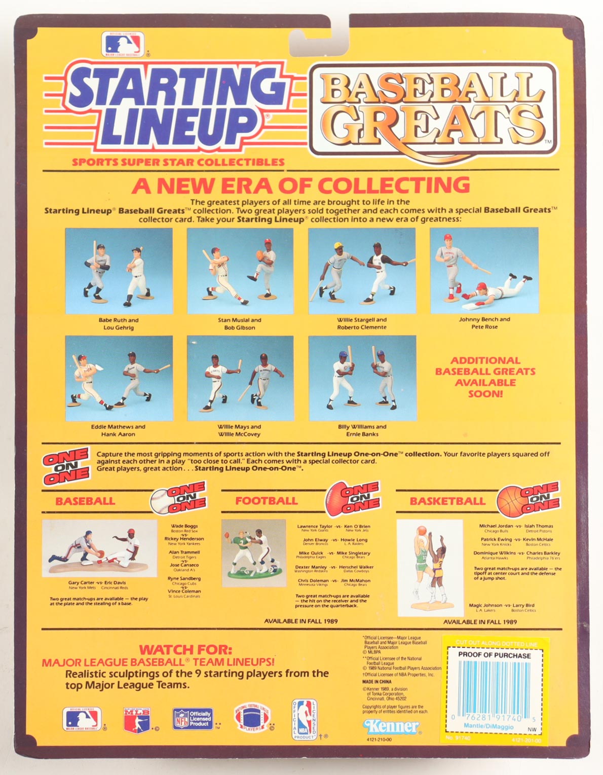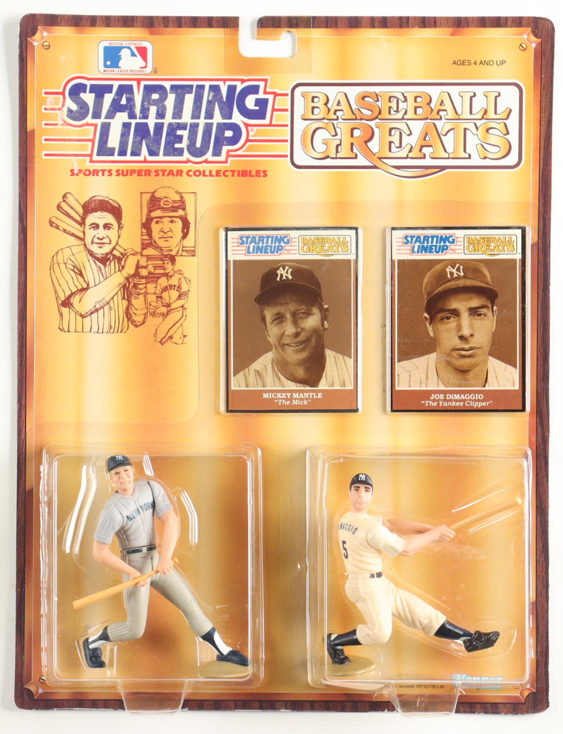 1989 Starting Lineup Baseball Greats Action Figures with Trading Cards featuring Mickey Mantle and Joe DiMaggio. Please note, the item is unsigned and there is some edge and corner wear on the packaging.