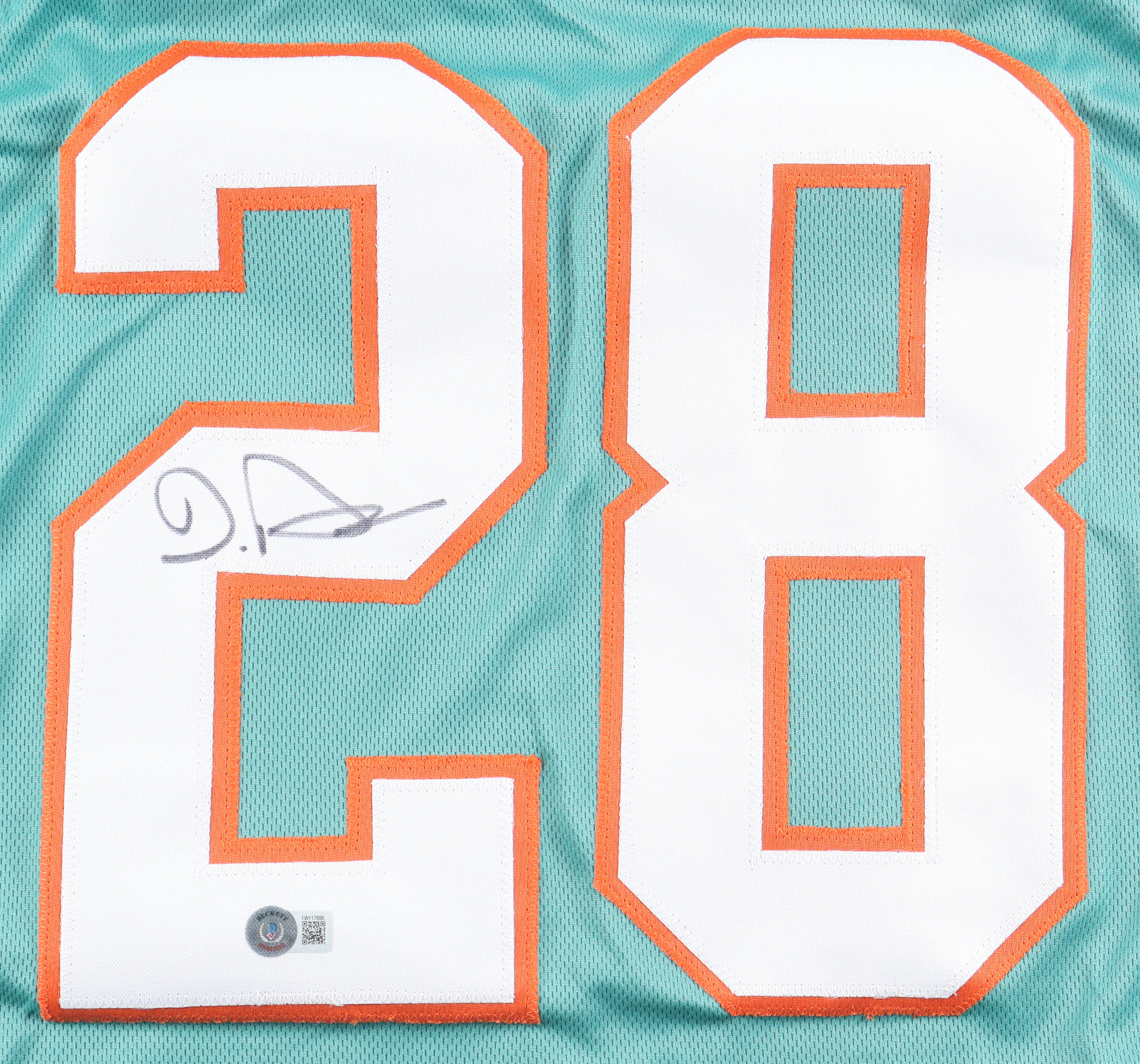 Custom jersey with everything sewn on, size XL. Has been hand-signed by De'Von Achane.