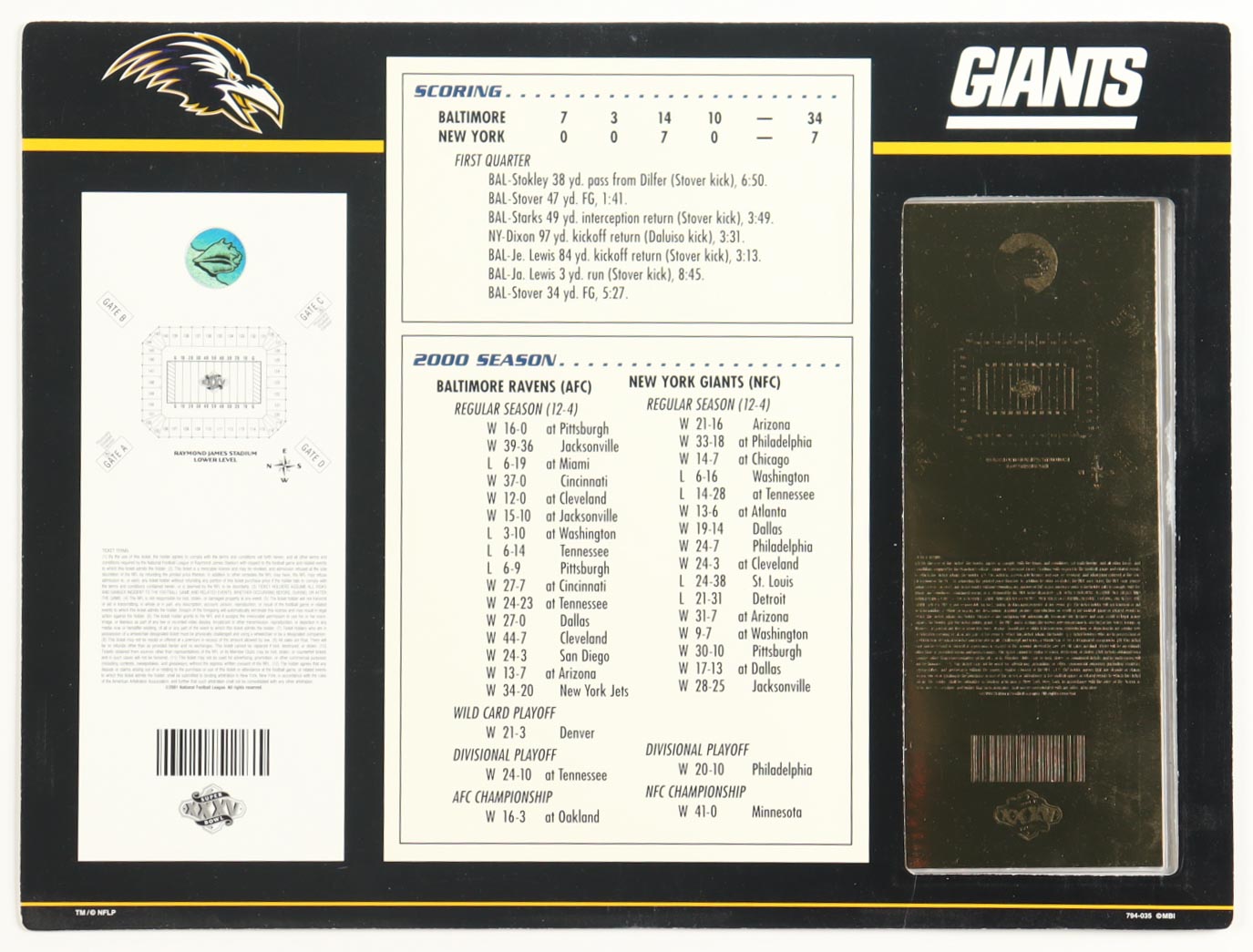 Commemorative Score Card that measures approximately 9" x 12" in size and come with a Super Bowl XXXV 23KT Gold Ticket. Please note, the item is unsigned.