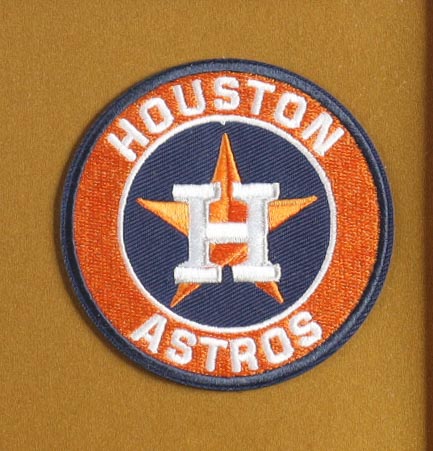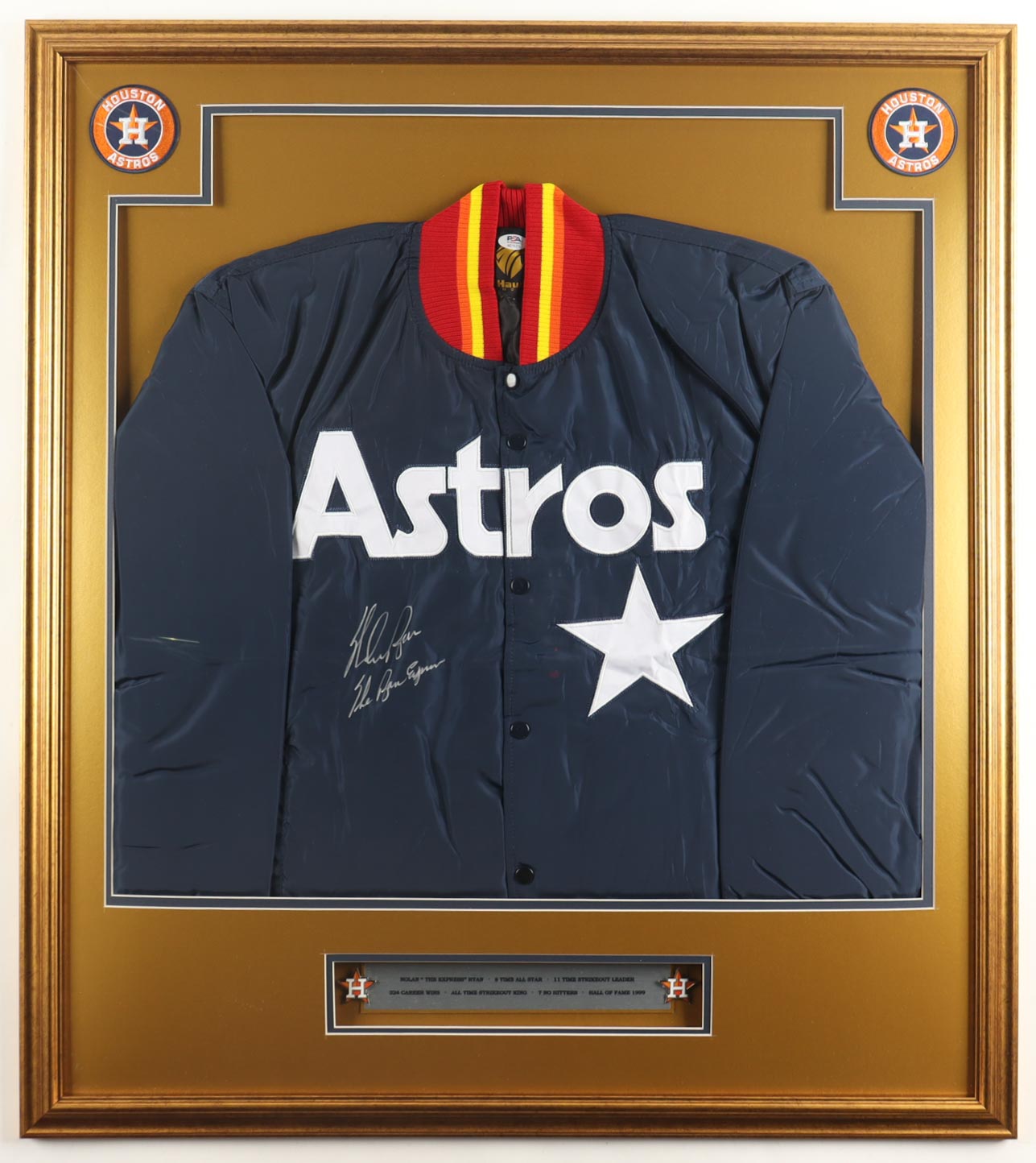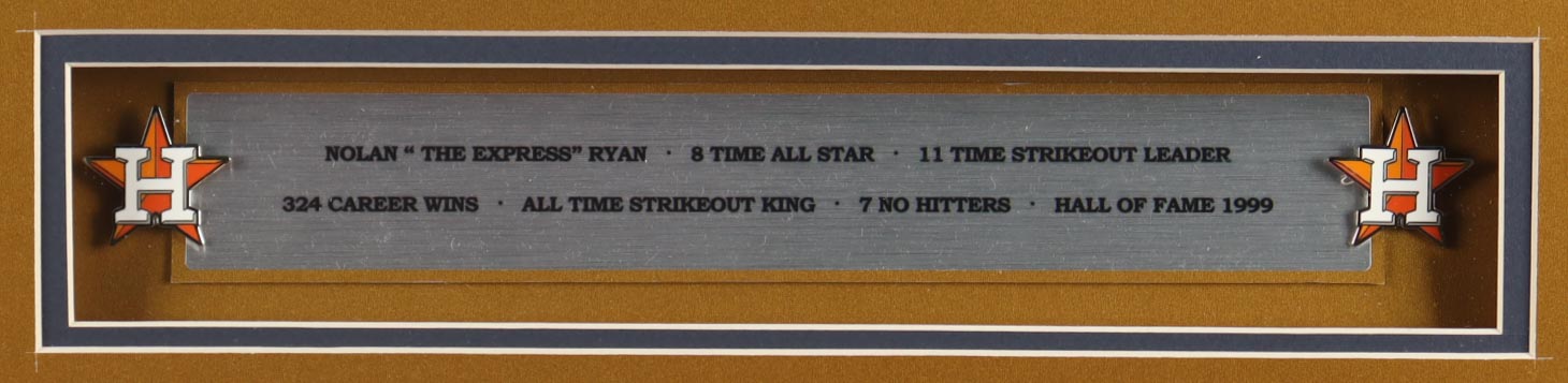 Custom frame display measures approximately 32" x 36" in size and features a jersey that has been hand-signed by Nolan Ryan (Houston Astros, HOF). The display also includes (2) Astros pins, (2) photos and (2) cloth team logo patches and a career statistics plaque.