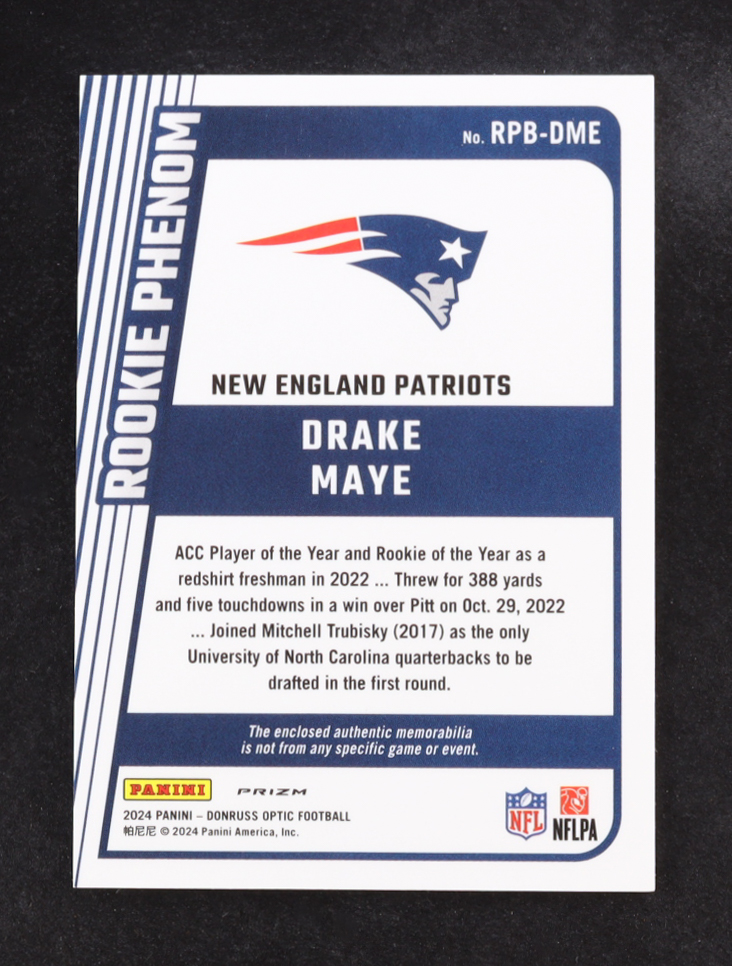 Drake Maye 2024 Donruss Optic Rookie Phenoms Blue Hyper Memorabilia #RPB-DME RC