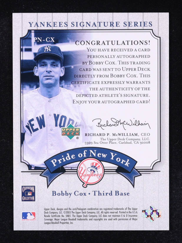 Bobby Cox 2003 Upper Deck Yankees Signature Pride of New York Autographs #PN-CX