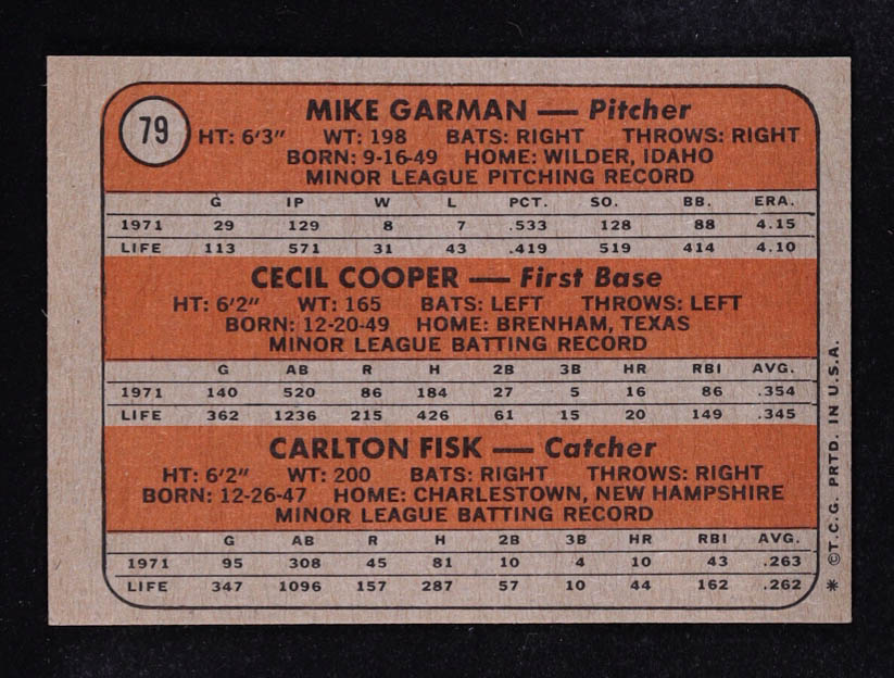 Mike Garman / Cecil Cooper / Carlton Fisk 1972 Topps Rookie Stars #79 RC