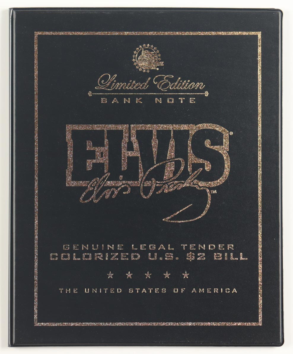 Elvis Presley Genuine Legal Tender Colorized U.S. $2 Bill Commemorative Edition Bank Note. Includes folder. Please note, Presley's autograph is a facsimile.