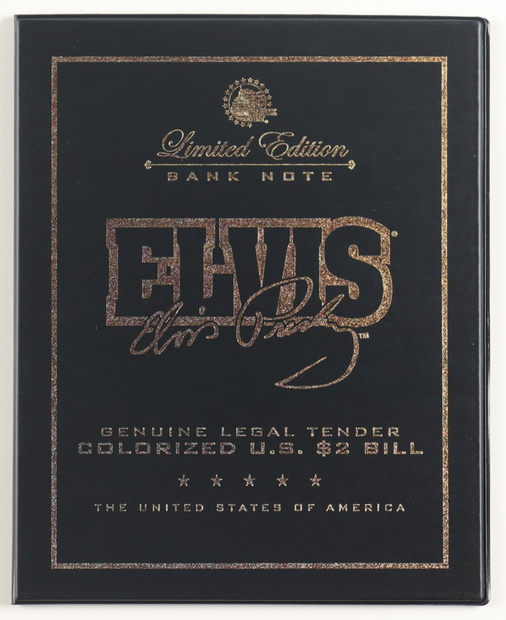 Elvis Presley Genuine Legal Tender Colorized U.S. $2 Bill Commemorative Edition Bank Note. Includes folder. Please note, Presley's autograph is a facsimile.