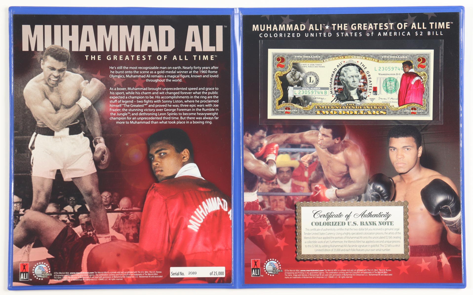 Muhammad Ali Genuine Legal Tender Colorized U.S. $2 Bill Commemorative Edition Bank Note. Includes folder as shown. Please note, Muhammad Ali's autograph is a facsimile.