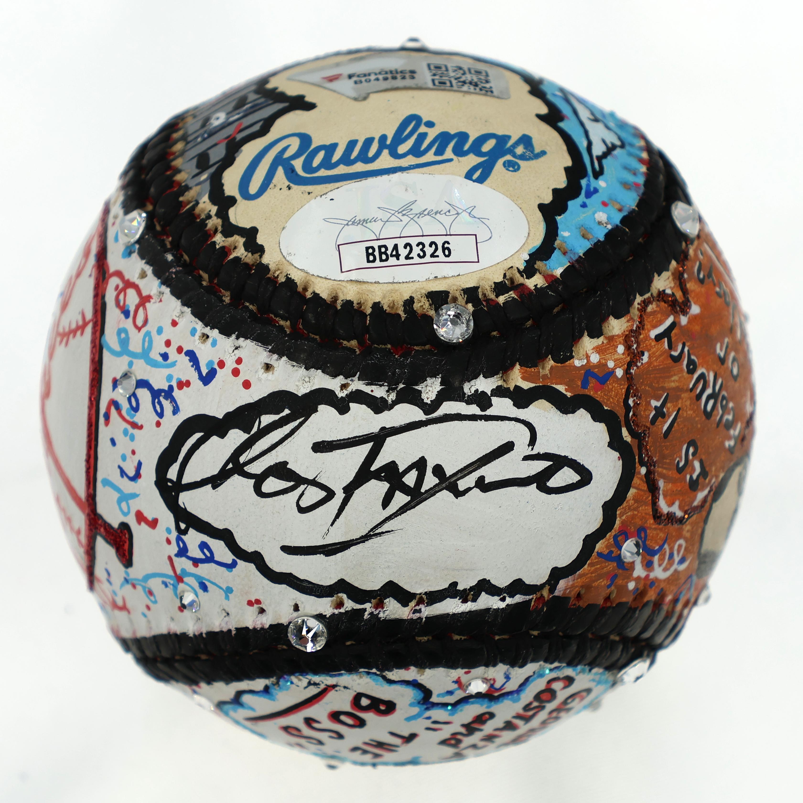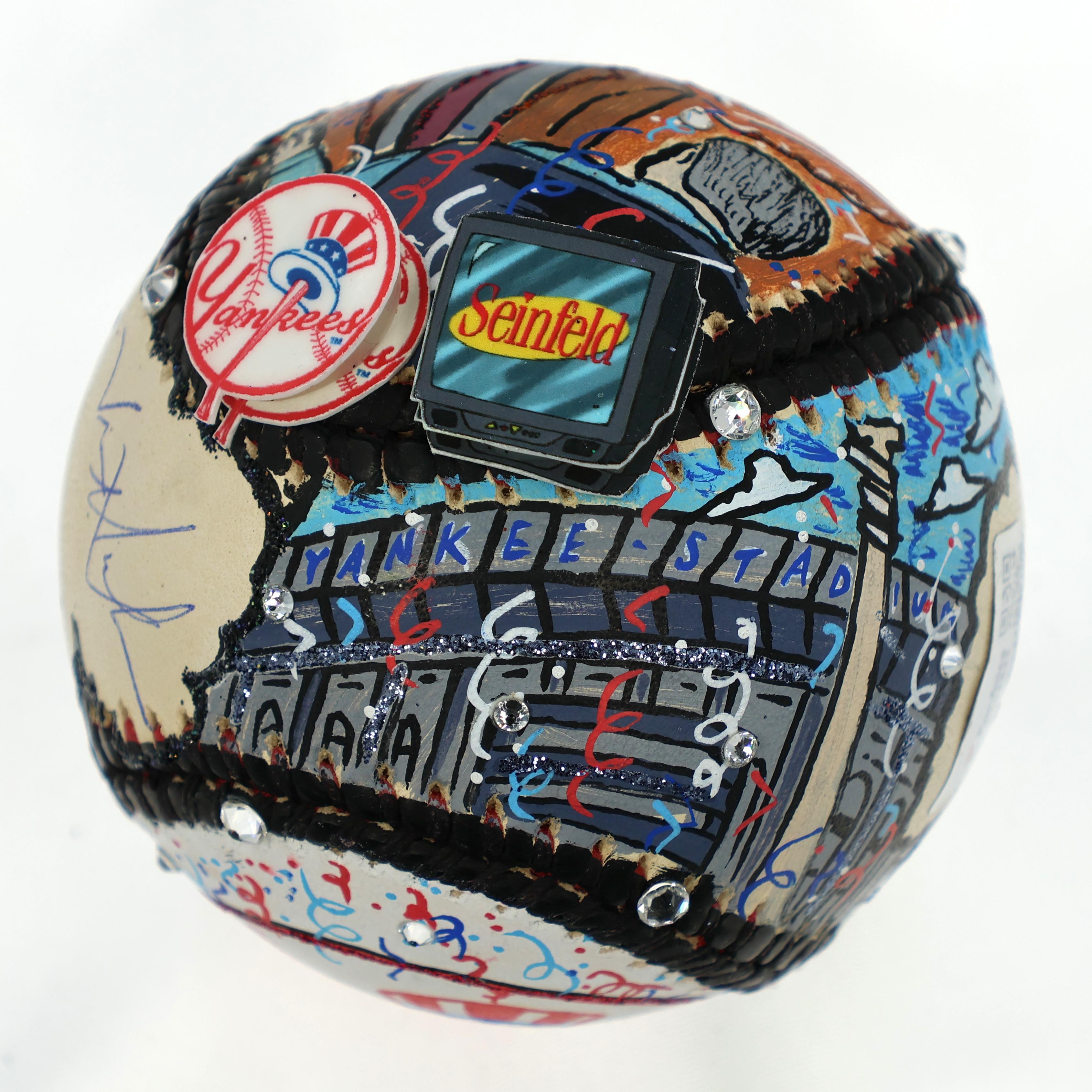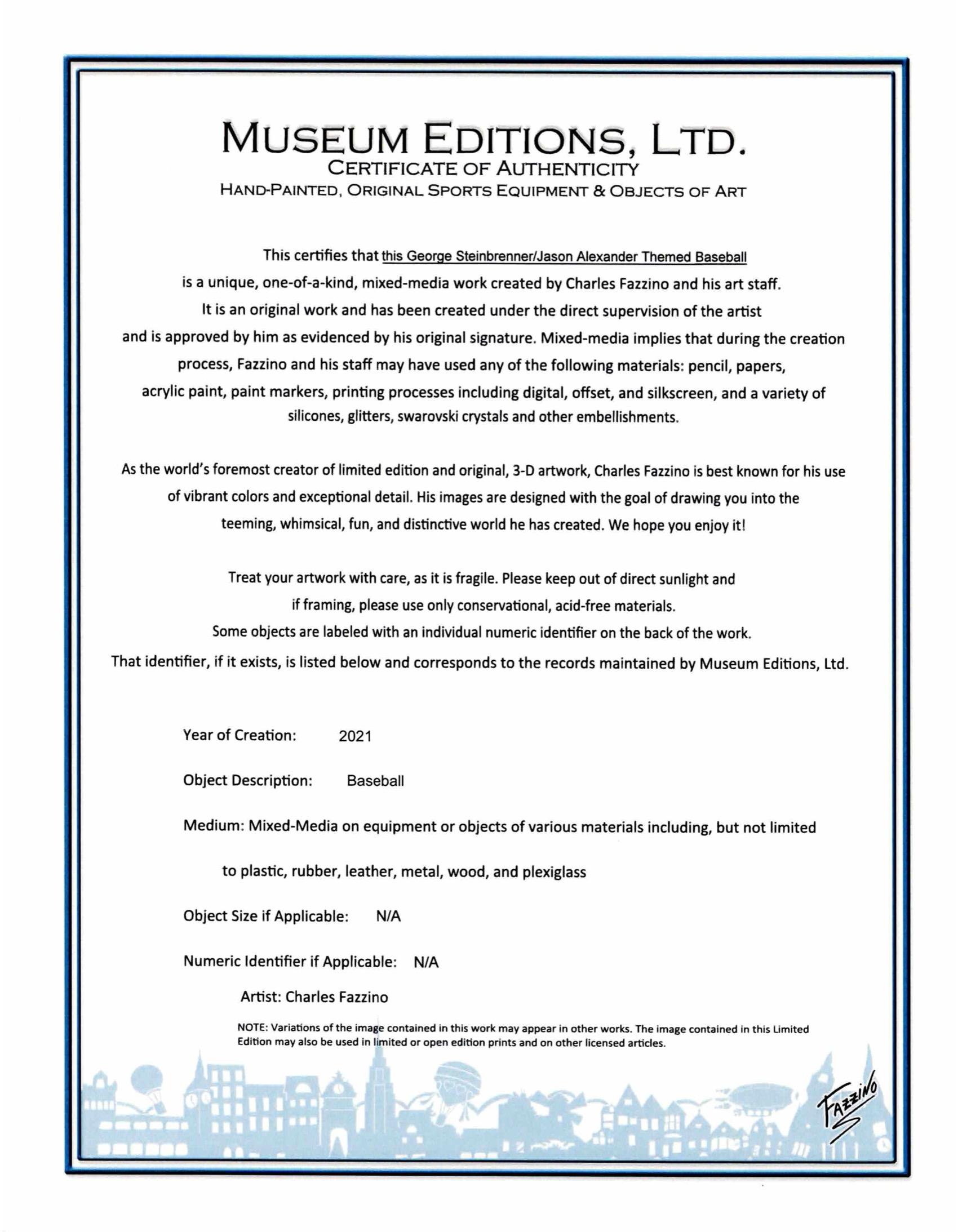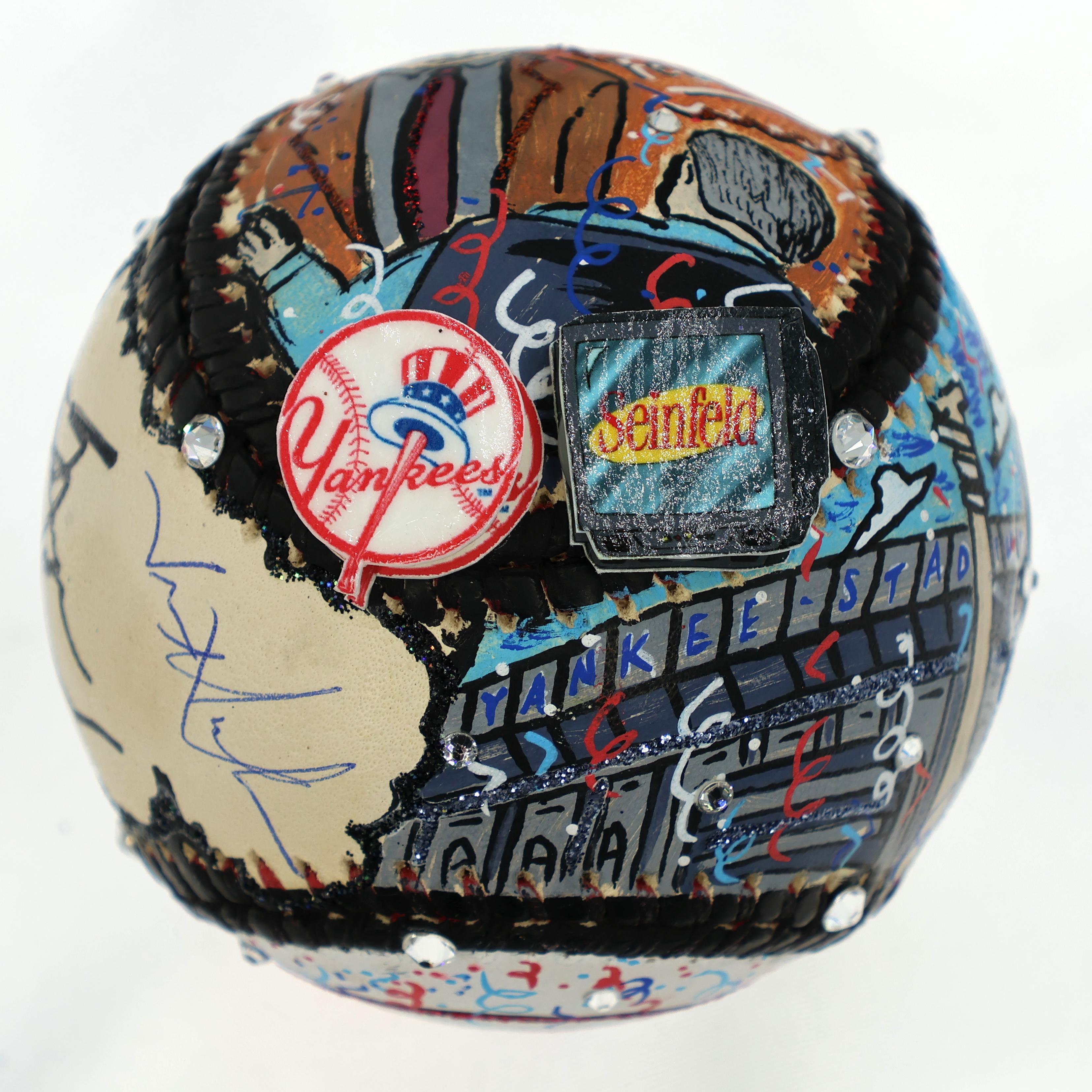 3-D Pop Art Commemorative baseball has been hand-signed by George Steinbrenner (D. 2010, Former Owner of the New York Yankees) and Jason Alexander (George Costanza). The baseball includes original art and has been hand-signed by renowned pop artist, Charles Fazzino.
