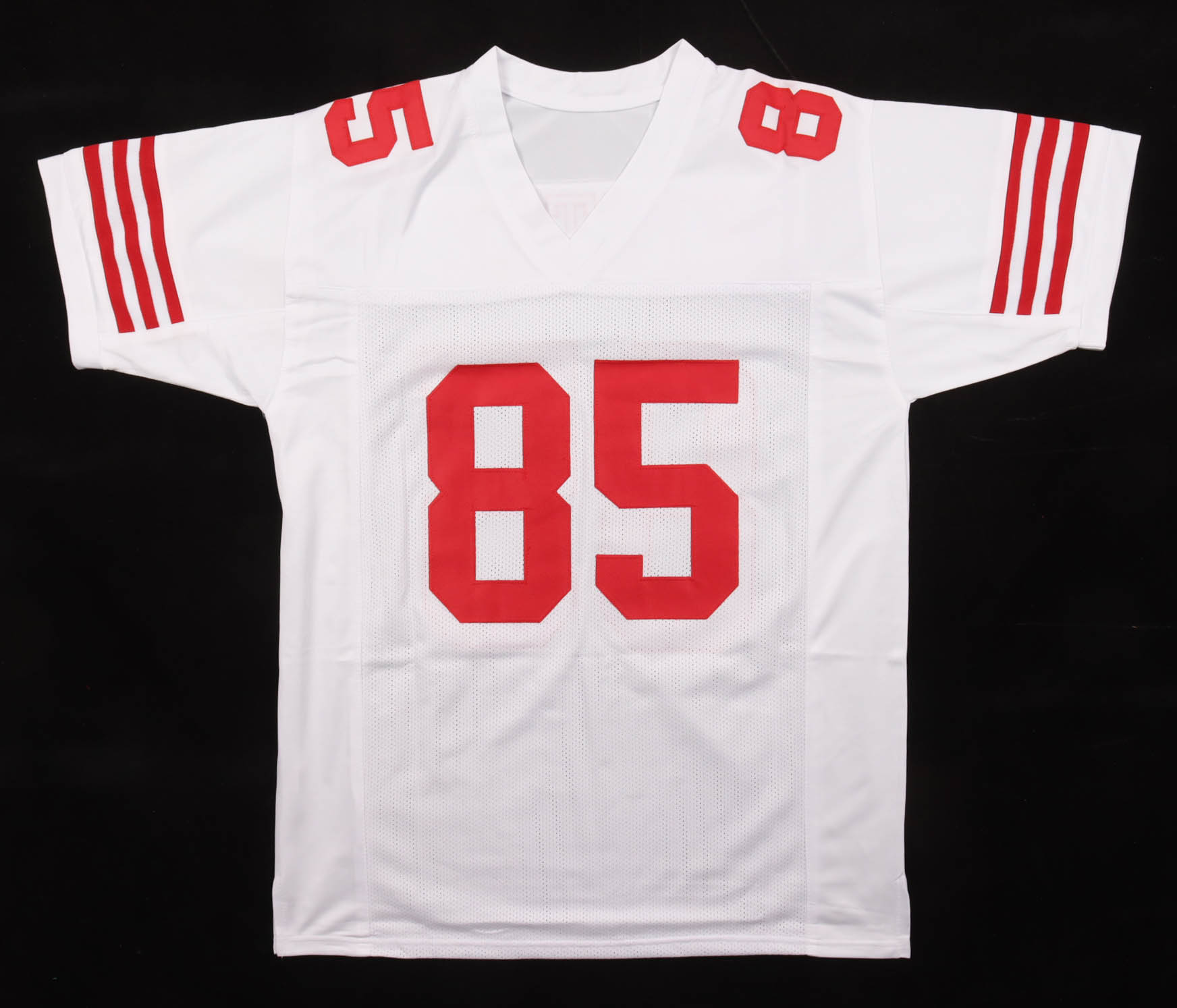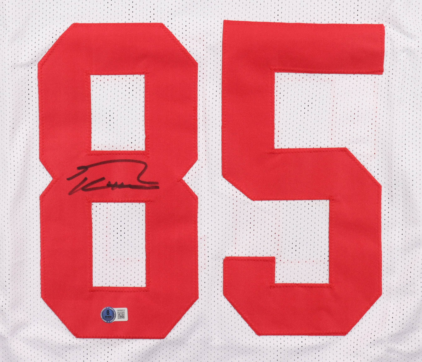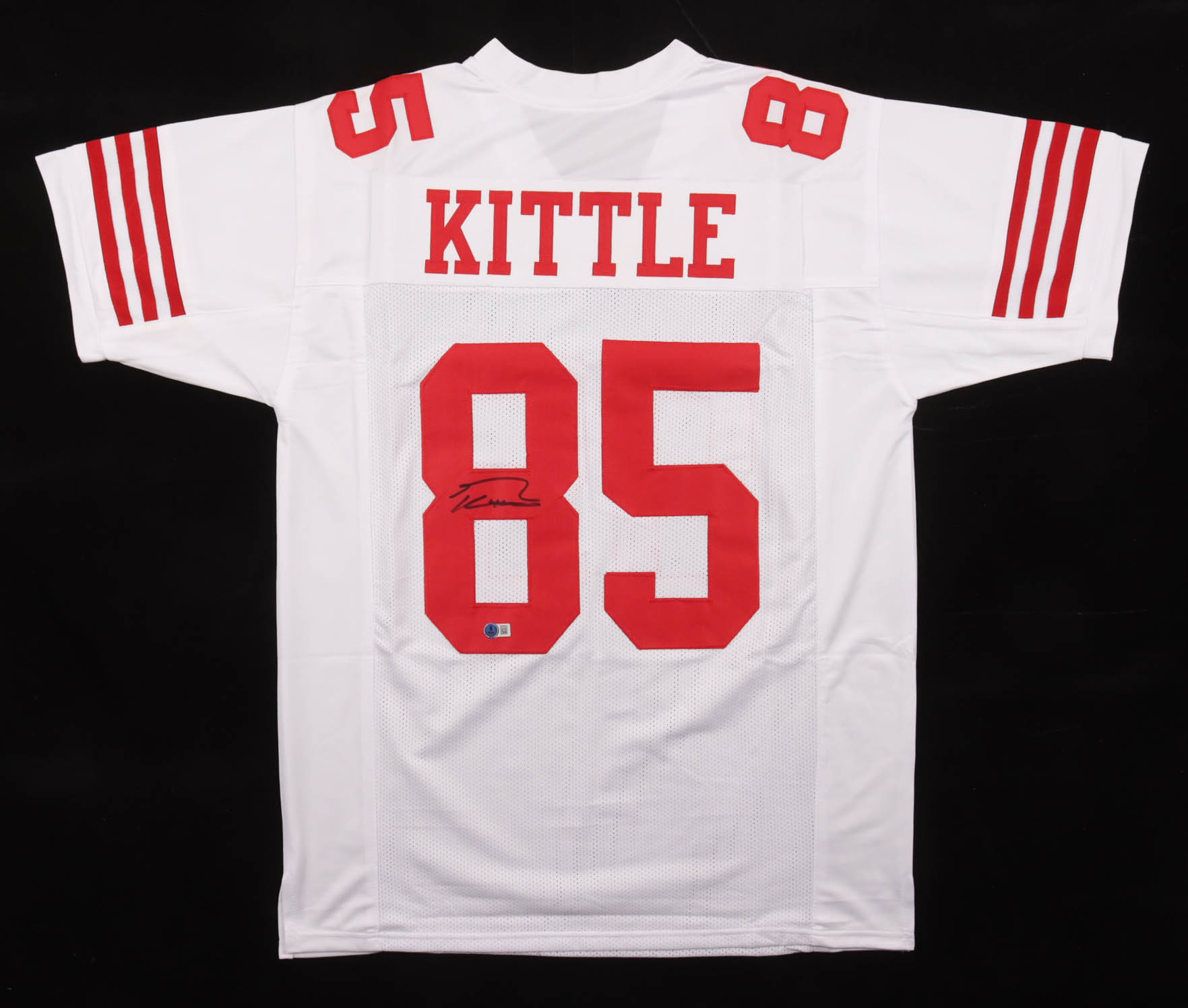 Custom jersey is size XL, everything is sewn on, and has been hand-signed by George Kittle.