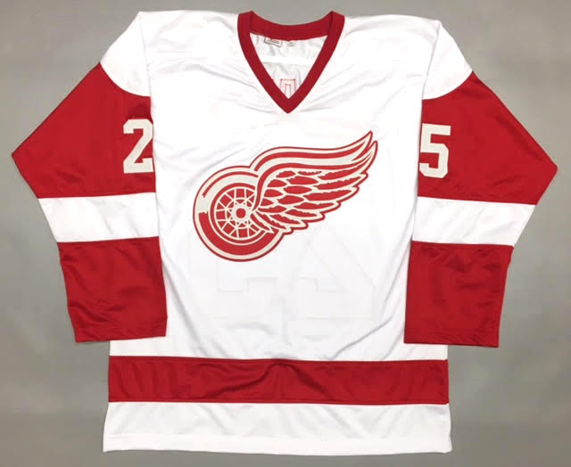 Custom on-ice style jersey. Everything is sewn on, size XL. Hand-signed and inscribed in black felt-tip pen by Darren McCarty.